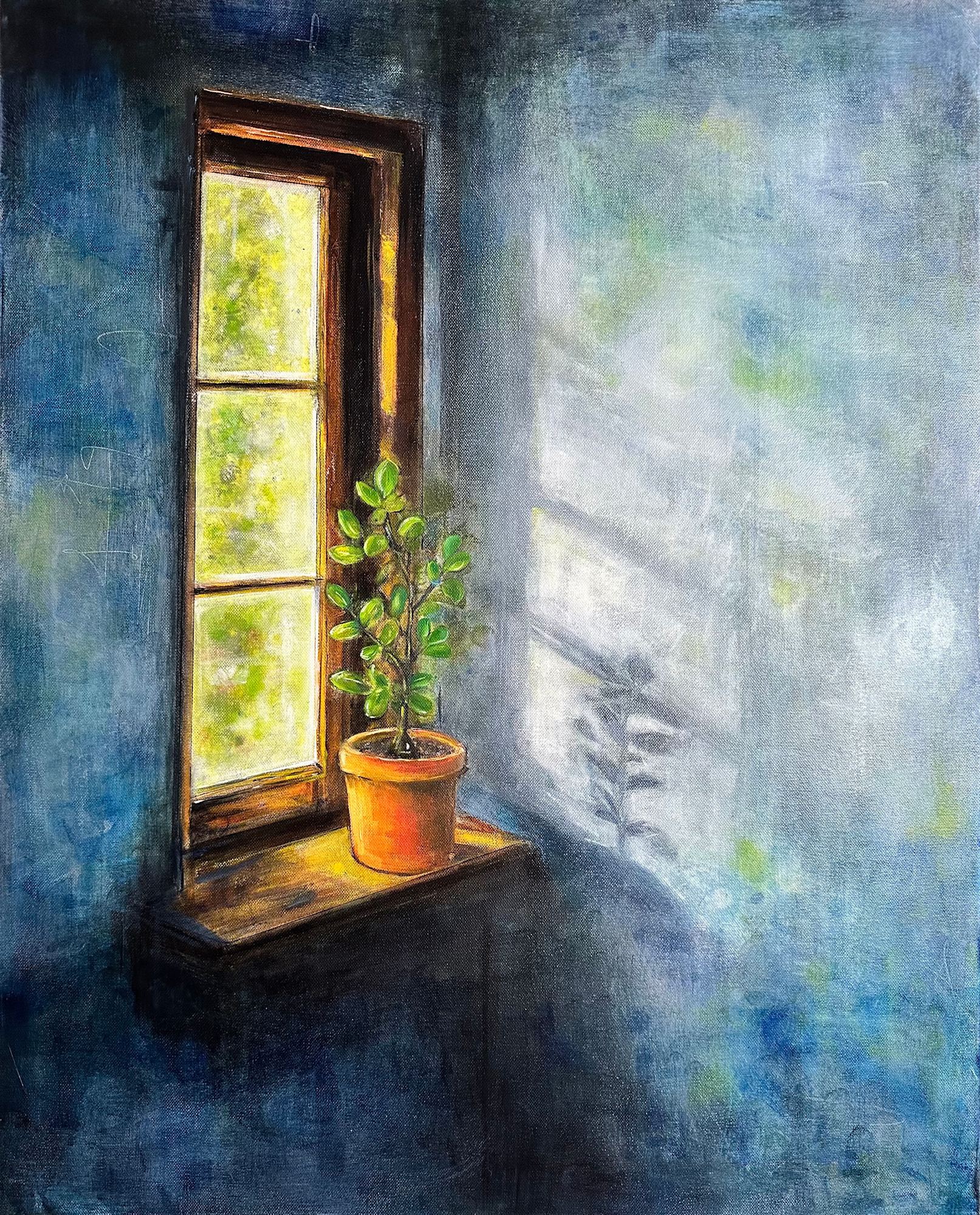 That moment between sunset and twilight, when neither day nor night fully take hold. Colours stain the air; edges blur. This painting holds that liminal space — a memory of light that stays even as it fades.