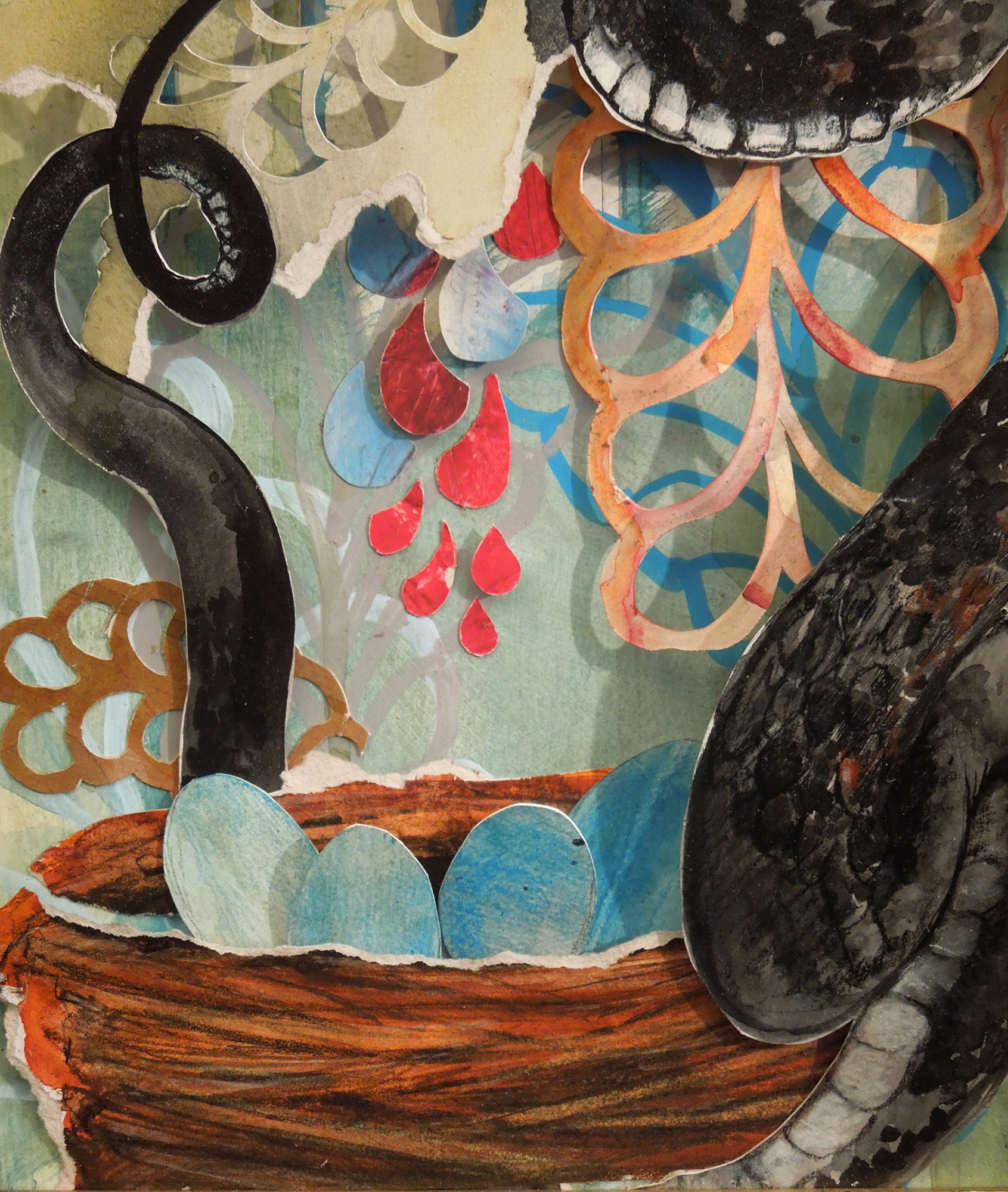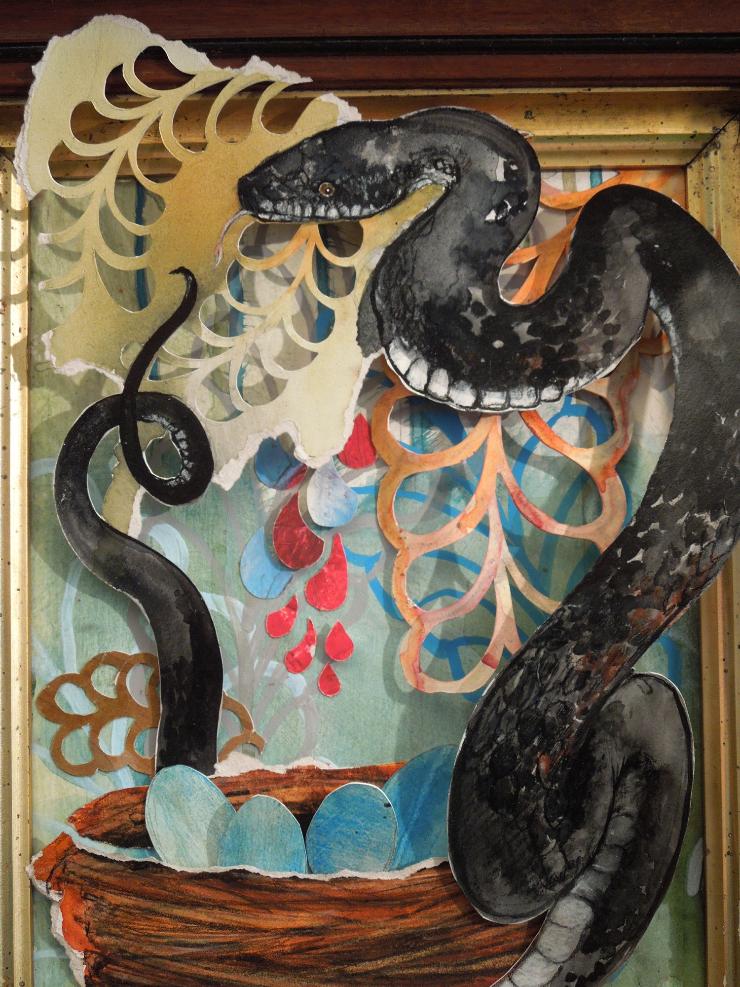 Acrylic ink and colored conte with hand cut paper and recycled frame