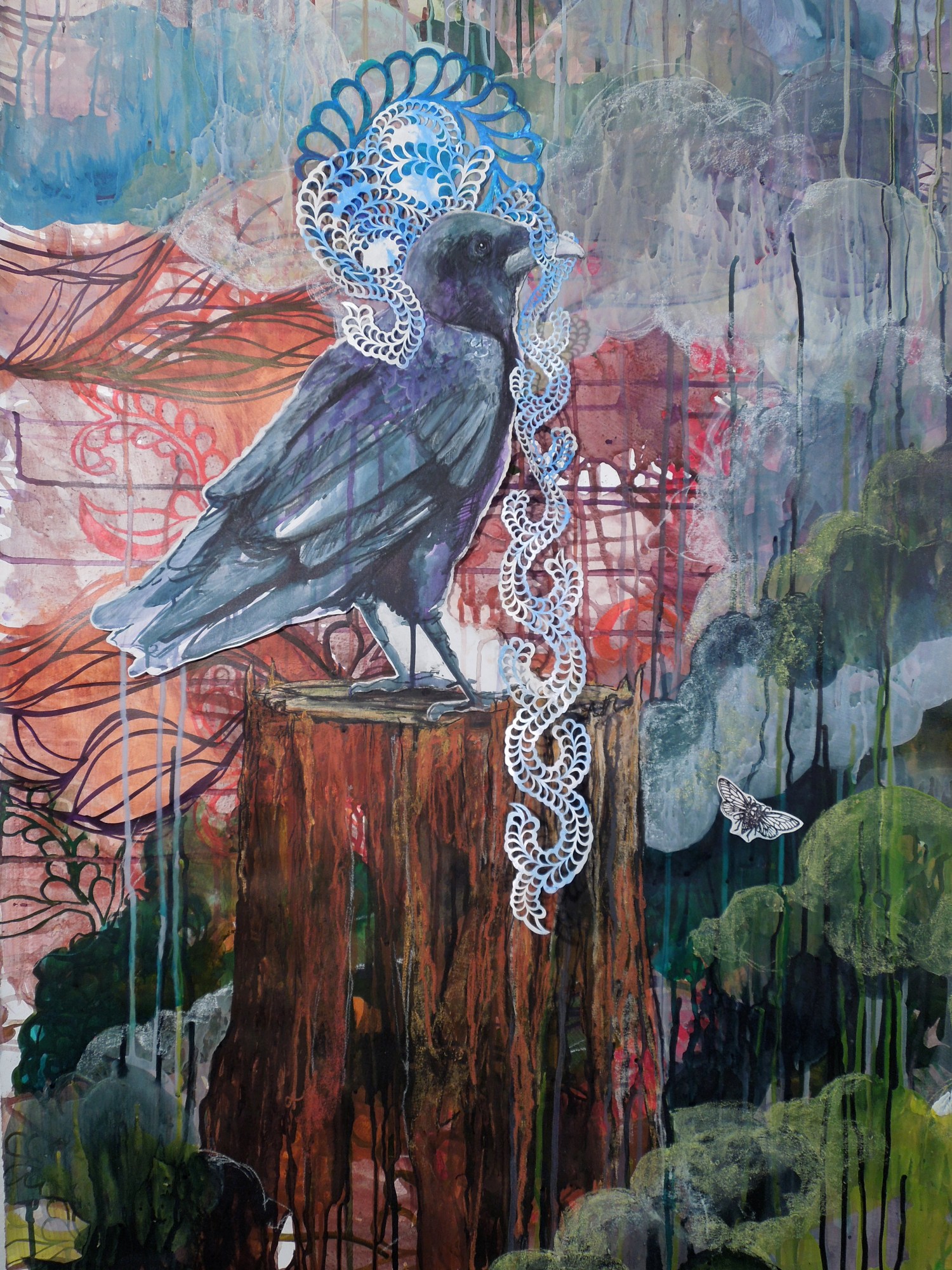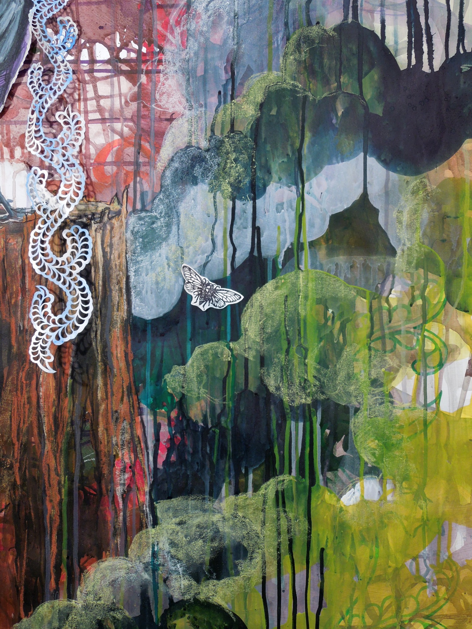 Acrylic ink and colored conte on paper with collage and hand cut tyvek elements