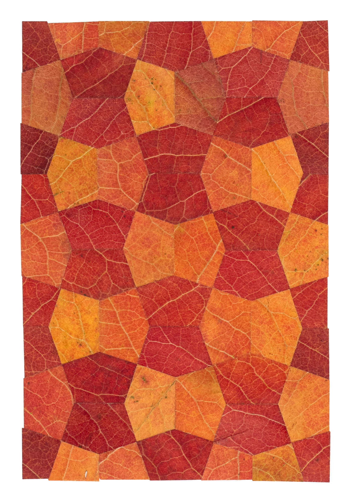 MessageThe quilt design is inspired by the pentagonal geometric form revealed in a cross section of the Franklinia alatamaha seed capsule. Cairo pentagonal tiling was selected for its unique ability to create multiple variations with assignment of color. The color range of Franklinia alatamaha leaves allows for distinct areas of color which also have interior variation and pronounced veining. Color blocking visually suggests papillon (butterfly) in alternating directions.