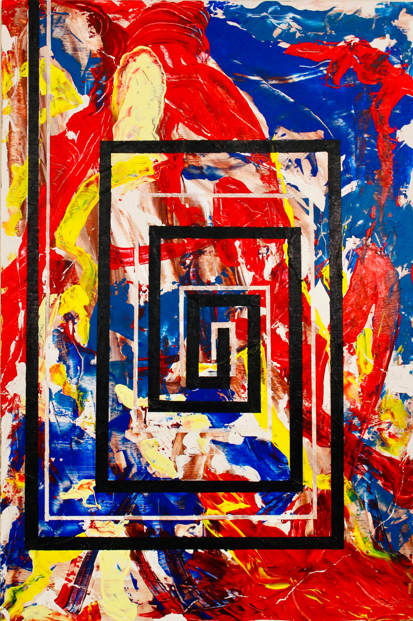 A play with amorphous background and hard geometric pathway either coming or going. Number two in the Pathway Series.