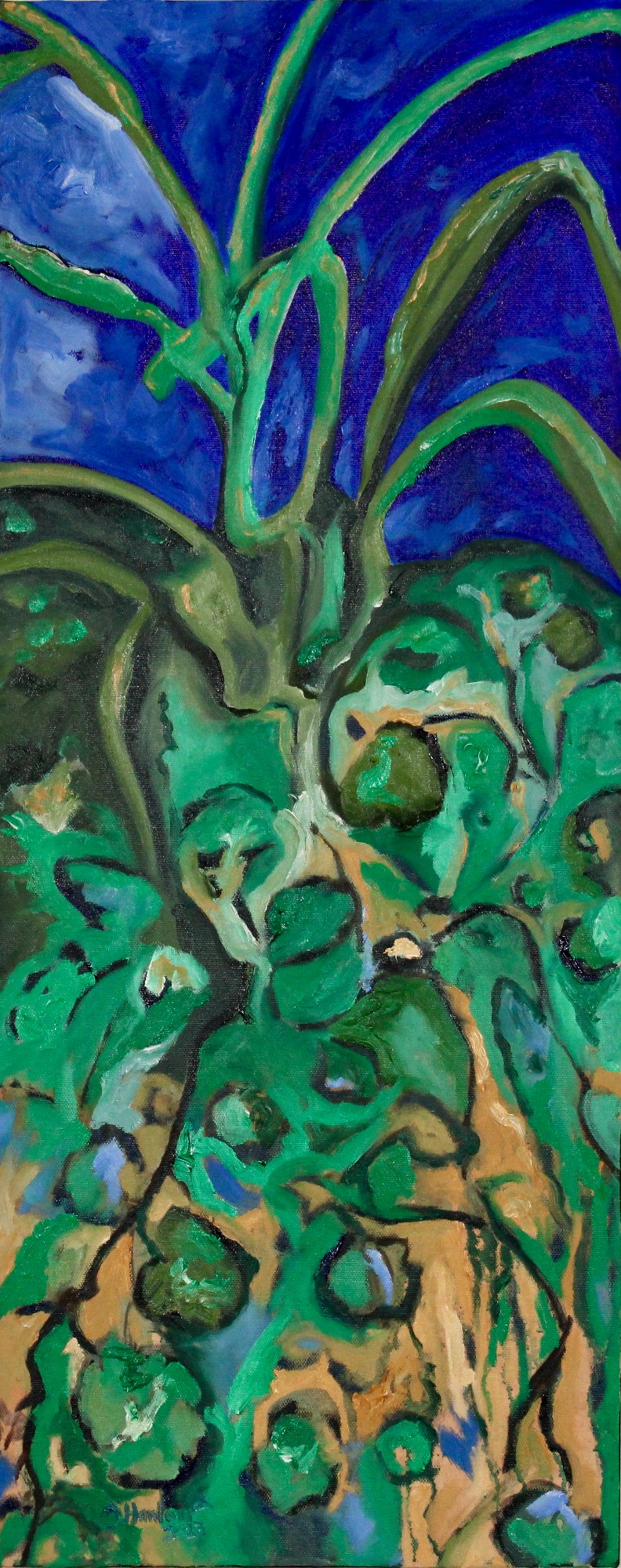 Scene from the Spring garden, this piece depicts the foliage in an abstract form and evokes some idea that something else lies within.
