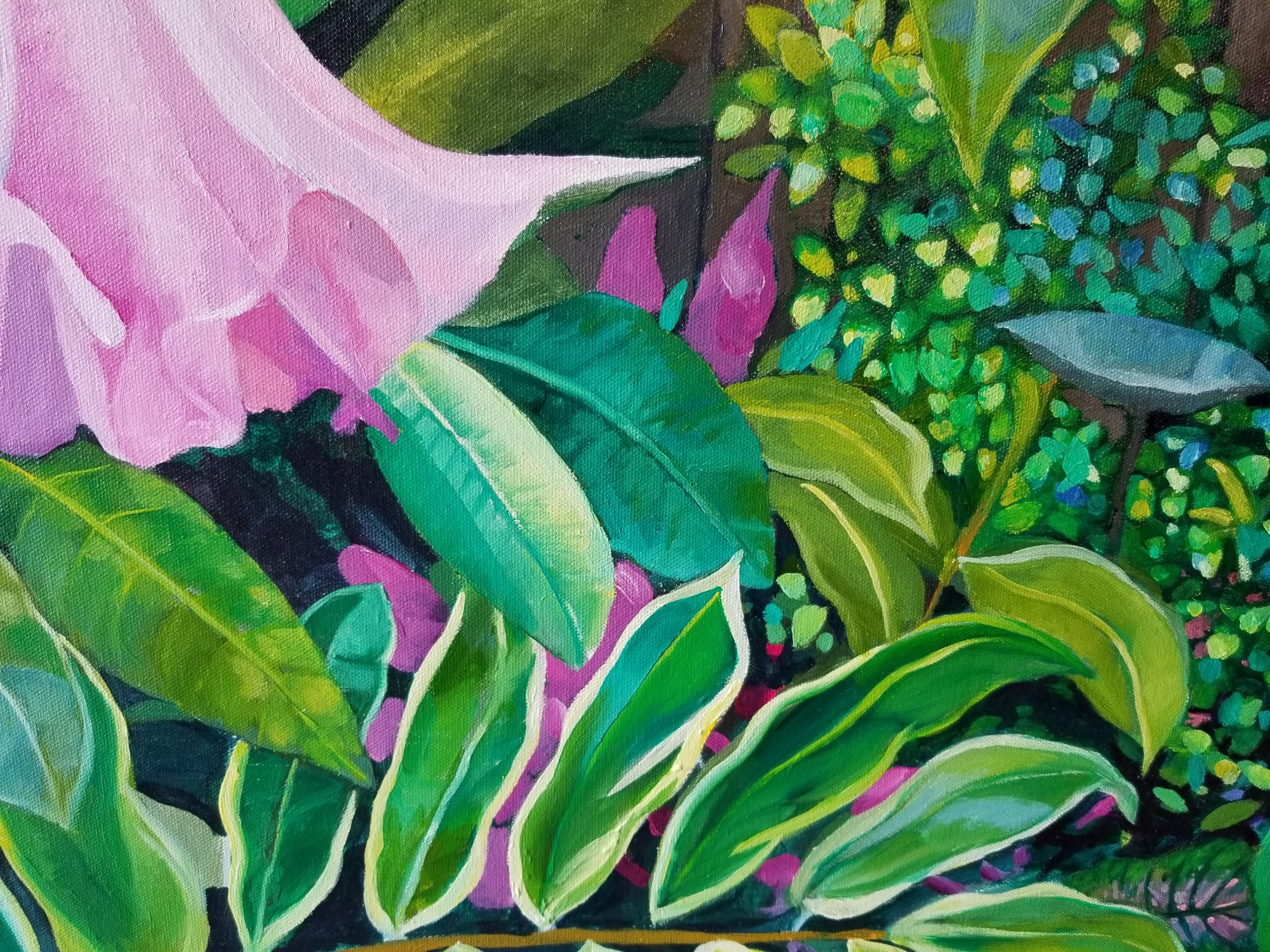 This is an oil on canvas painting of my backyard garden. This is one of a series of landscape paintings I became inspired to create after a couple of month long stays in Paris where I visited Monet’s home in Giverny.
