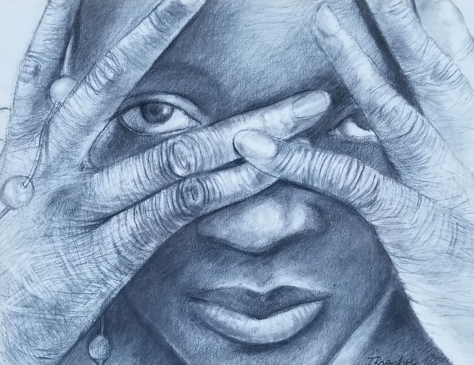 A portrait showing a woman hiding her face. The idea of shame or lack of appreciation for her own beauty.