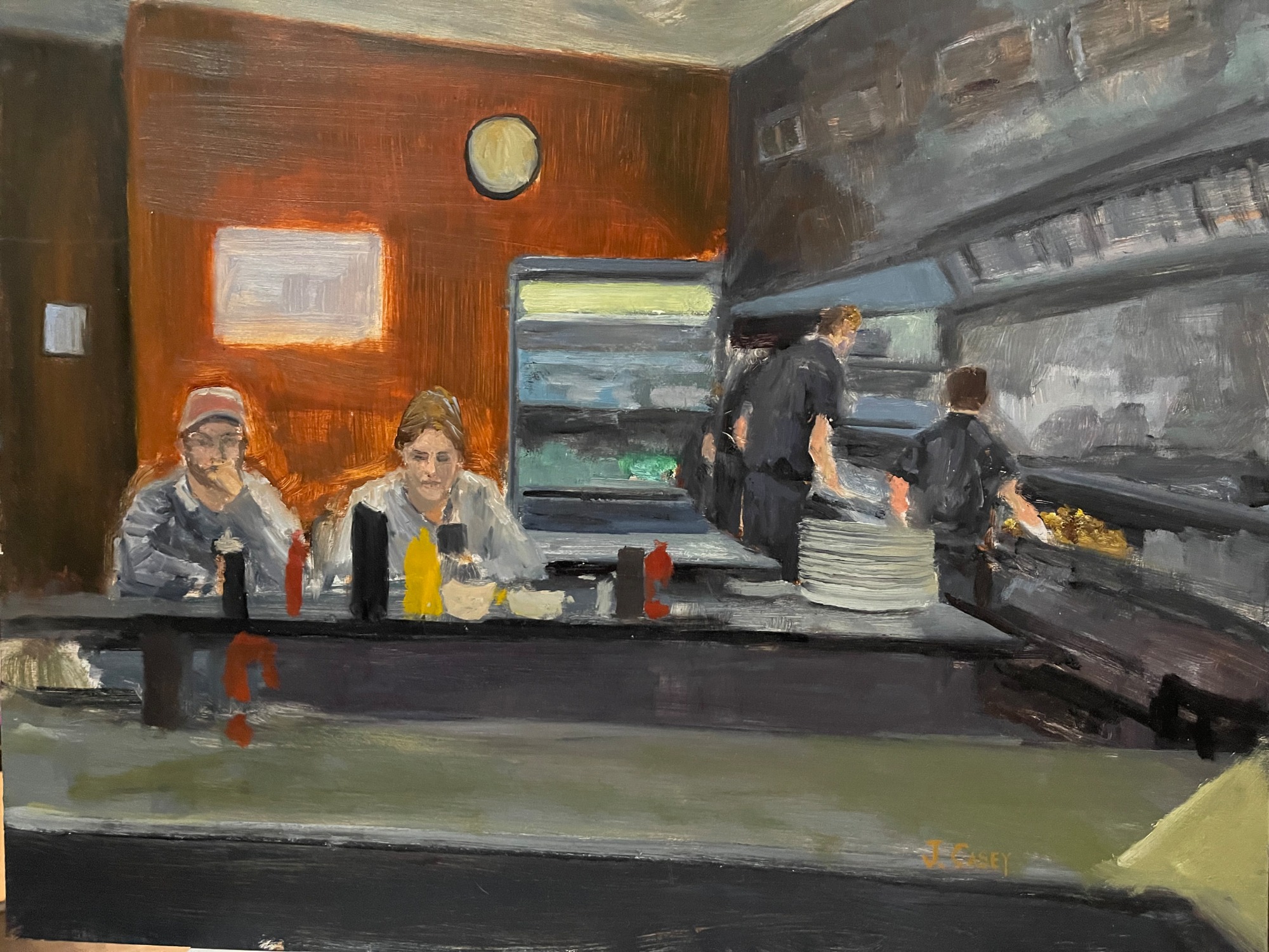 Painting inspired by observing a couple at a local diner the day before lockdown due to the COVID-19 pandemic in March of 2020.