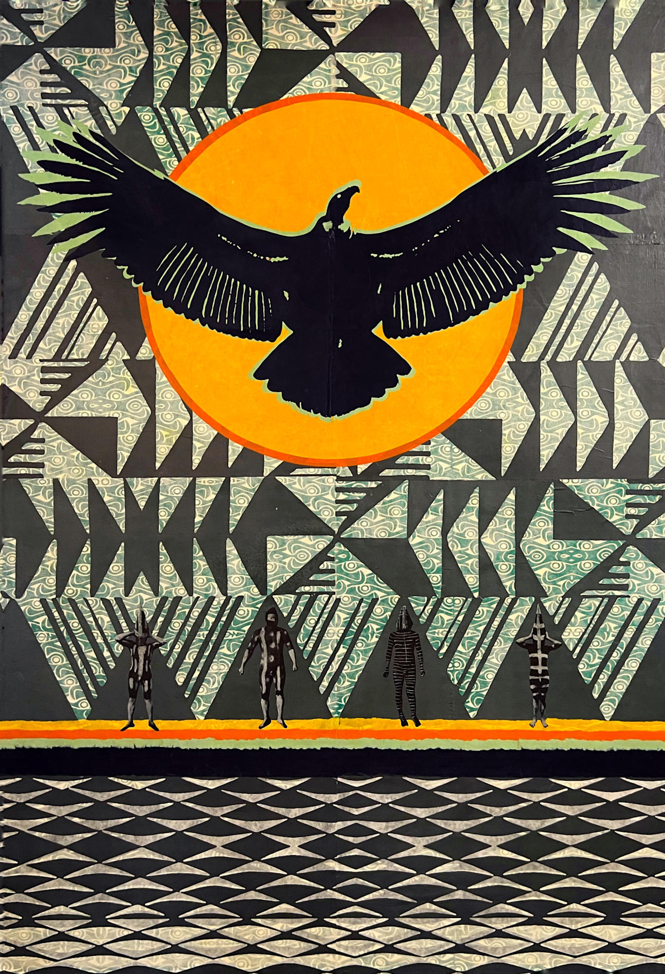 Journey to the Edge draws from the artist’s travels and treks across Patagonia’s rugged landscapes, evoking a pilgrimage through some of the world’s most remote and awe-inspiring terrain—often called “the end of the world.” Layered atop two base levels of woodblock prints on Sekishu Japanese paper, the work merges symbolic imagery from Rapa Nui (Easter Island) and Patagonia, connecting distant geographies through shared motifs of endurance, nature, and spirit. The first printed layer references the ancient birdman motif of Rapa Nui, while the second captures the shifting rhythms of Patagonia’s waters, mountains, and skies, experienced firsthand amid the region’s harsh yet breathtaking conditions. At its center, a Chilean condor soars across a glowing sun, both appliquéd from printed Sekishu paper, their colors carefully matched to the palette witnessed along the journey. Horizontal printed bars separate and balance the layers of earth, water, and sky, grounding the expansive imagery. At once a reflection on migration, endurance, and the search for meaning at nature’s edges, Journey to the Edge invites viewers to contemplate the beauty—and the challenge—of reaching the world’s furthest horizons.