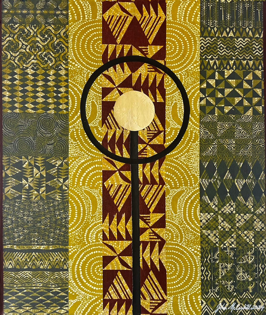 “Kilo Hōkū” — to gaze at the stars — evokes the ancient practice of celestial navigation, where knowledge was carried not on maps, but in memory, rhythm, and light. In this richly layered work, hand-carved woodcut patterns ripple like ocean swells and wind currents, converging around a luminous golden disc: a sun, a star, a fixed point in a sea of motion. The deep black ring, precise and timeless, recalls the eye of the wayfinder—anchored in the heavens, yet always journeying.