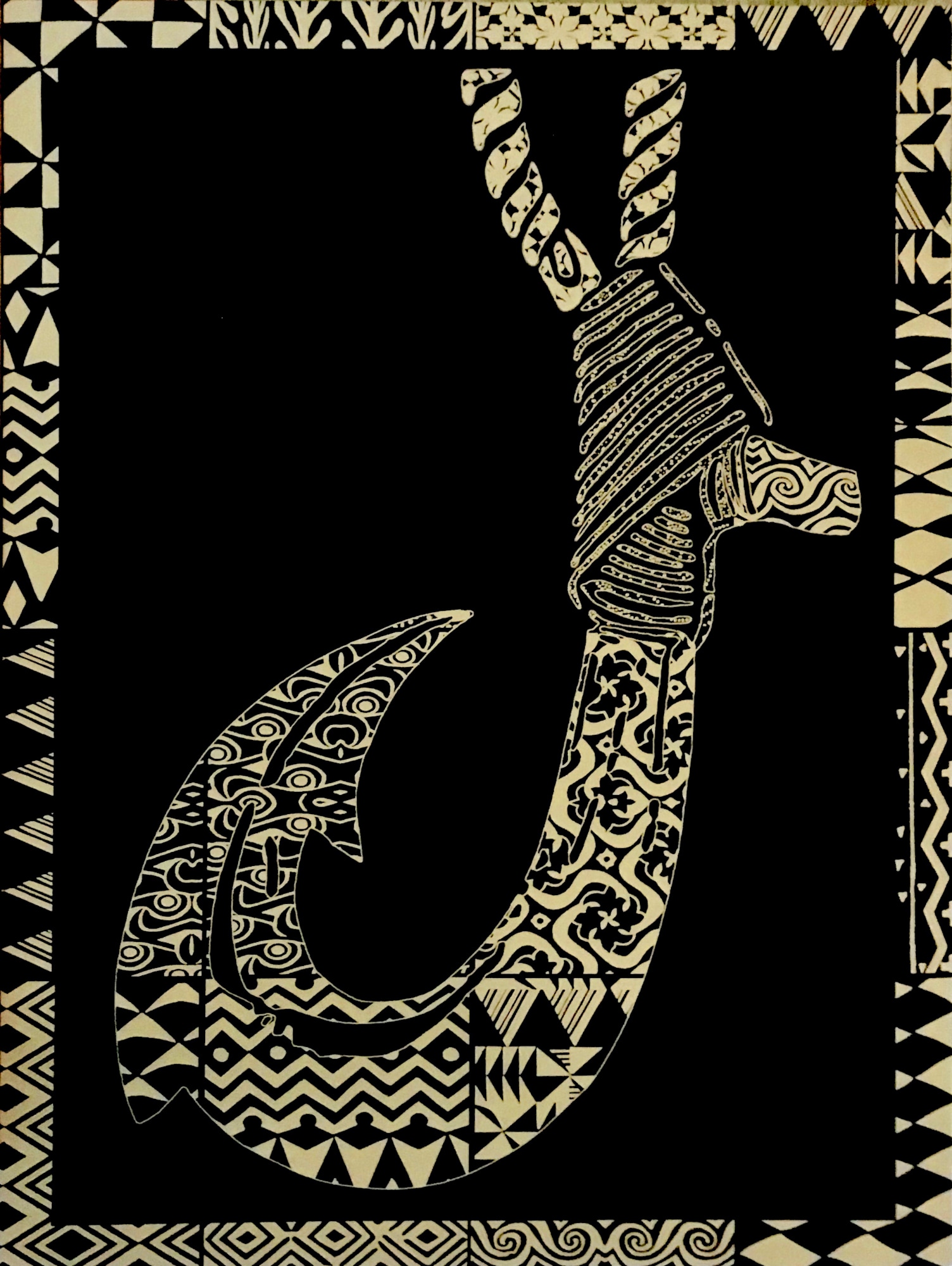 John McCaskill's artwork draws on the ancient Polynesian symbol of the makau (fish hook), revered for its connection to strength, sustenance, and safe passage across the ocean. Created while living in Hawai‘i, the piece is layered with indigenous and tribal-inspired patterns that echo the rhythms of the sea and the guiding hand of ancestral wayfarers. Part of the artist’s Wayfaring series, the work speaks to the enduring legacy of navigation, exploration, and cultural transmission—charting a path shaped by those who came before, and inspiring journeys still to come.