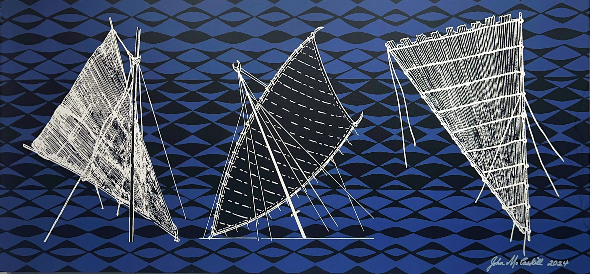 This work pays homage to the enduring spirit of Polynesian wayfinding and the legendary double-hulled canoe, Hokuleʻa. At its heart are three traditional sail forms, inspired by archival illustrations at the Bishop Museum in Honolulu—visual echoes of the navigators who read wind, stars, and swells to traverse vast oceans.