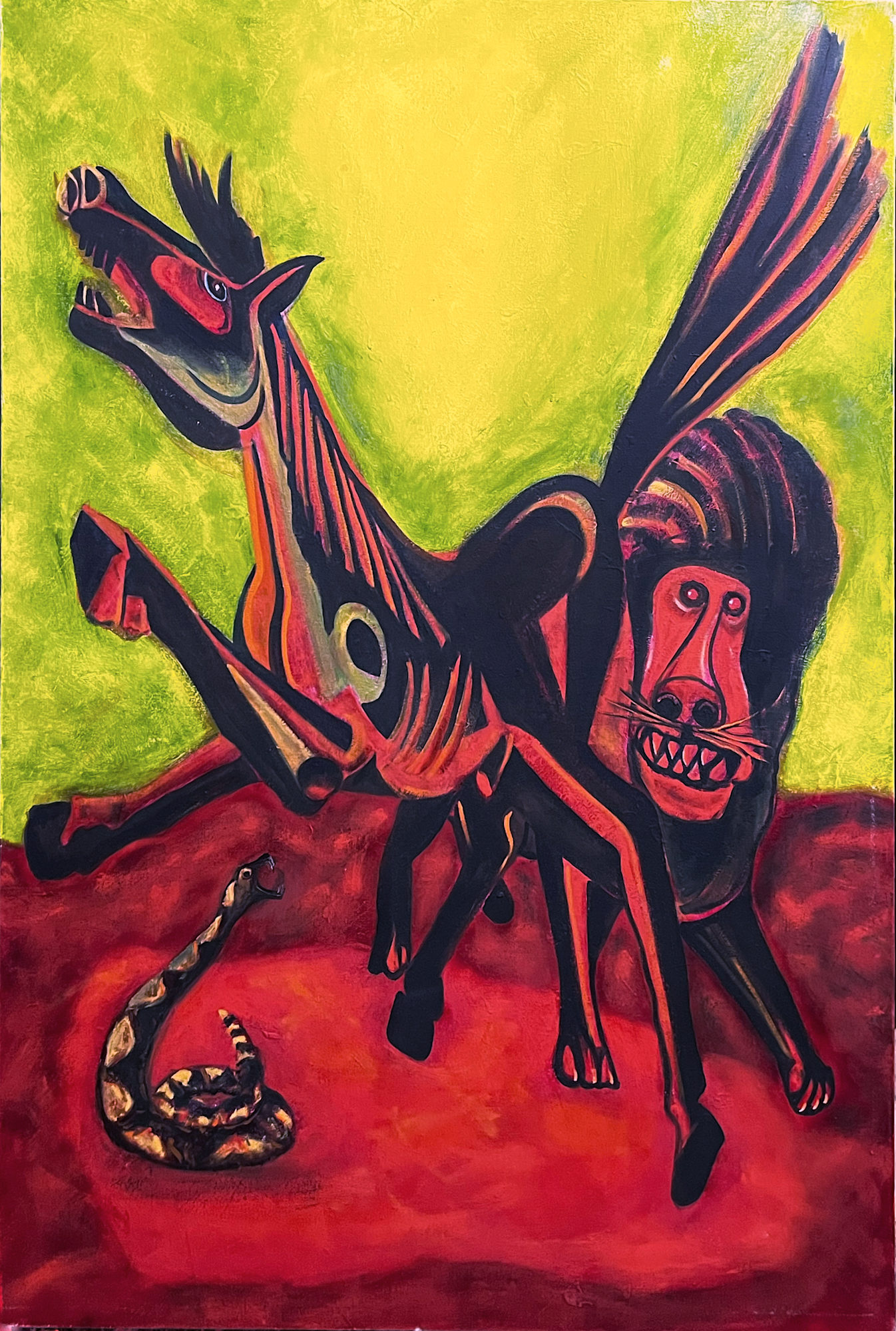 McCaskill’s stylized forms and bold palette evoke the symbolic power found in Tamayo’s work—where animals are never just animals, but ancient forces, messengers, or memories. This tribute honors the emotional gravity of Tamayo’s vision while asserting a fierce, personal interpretation of wildness, fear, and survival.
