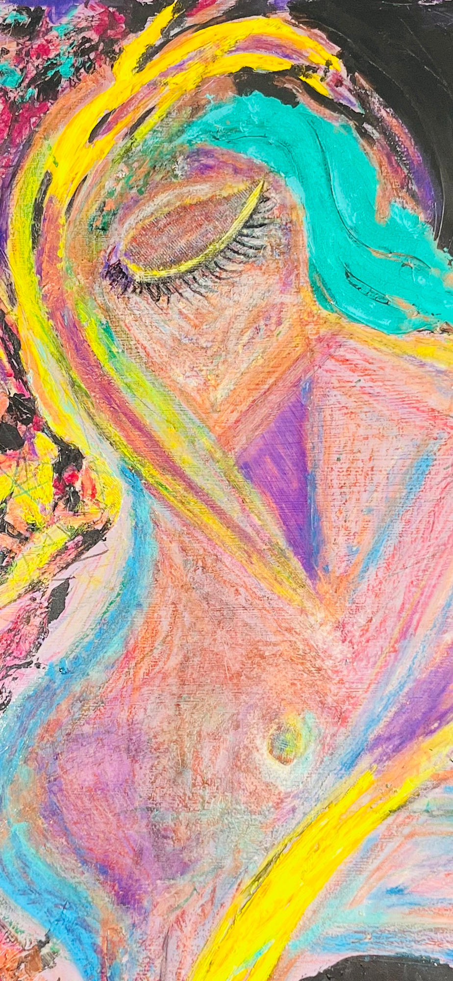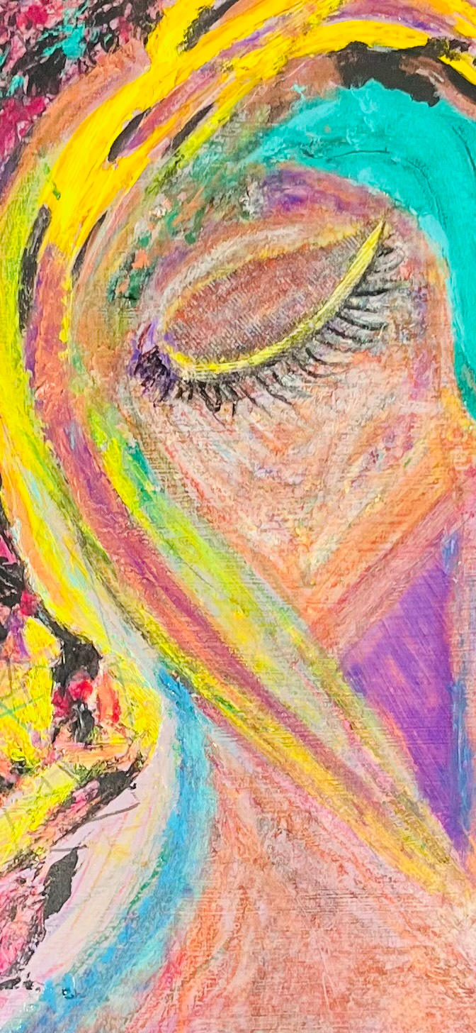 "Modest Me" is an abstract work that balances simplicity and complexity. A woman's figure emerges through bold, angular lines and muted tones, accentuating her striking purple skin—symbolizing royalty, rarity, and counterculture. Her closed, oversized eye, framed by sweeping lashes, evokes introspection and quiet strength. The interplay of sharp lines and fluidity conveys both vulnerability and resilience, capturing a profound stillness that embodies grace and the power of reflection