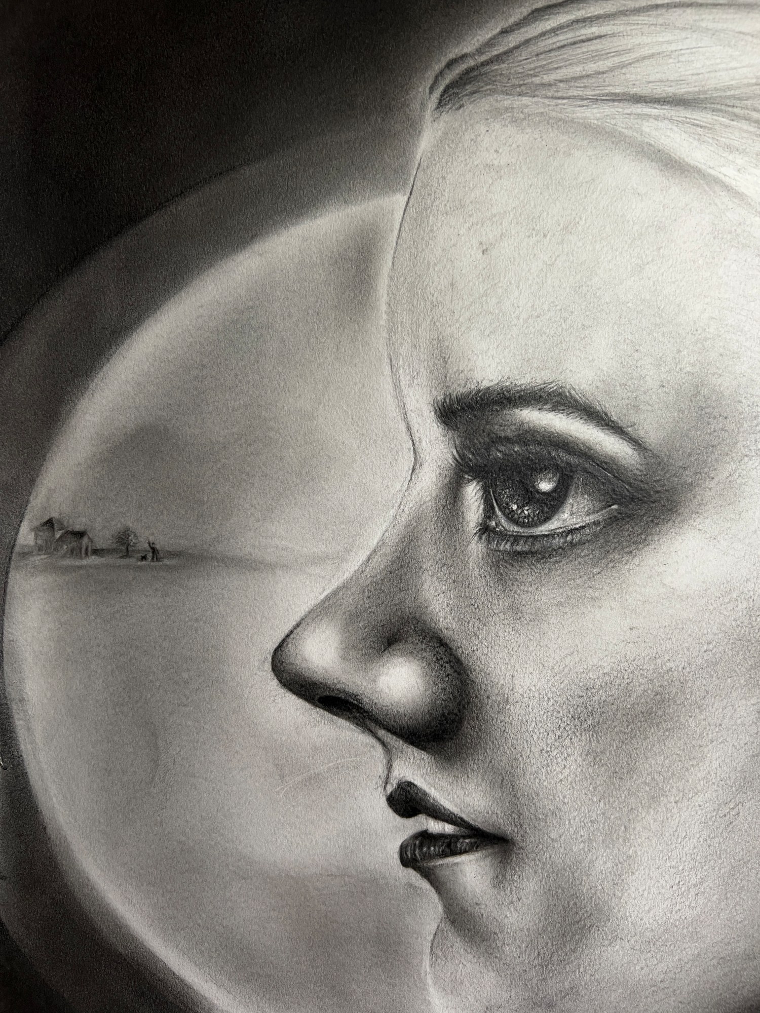 This graphite drawing portrays a young woman in a side profile, with a ship porthole visible beside her. Through the porthole, one can see a man and his dog, the man is bidding farewell. The dog, though incidental to the story, was included as a personal tribute to my love for them. The man and dog are depicted as small figures, as they are in the far distance. The woman is adorned with a pearl earring, a homage to the famous painting by Vermeer.