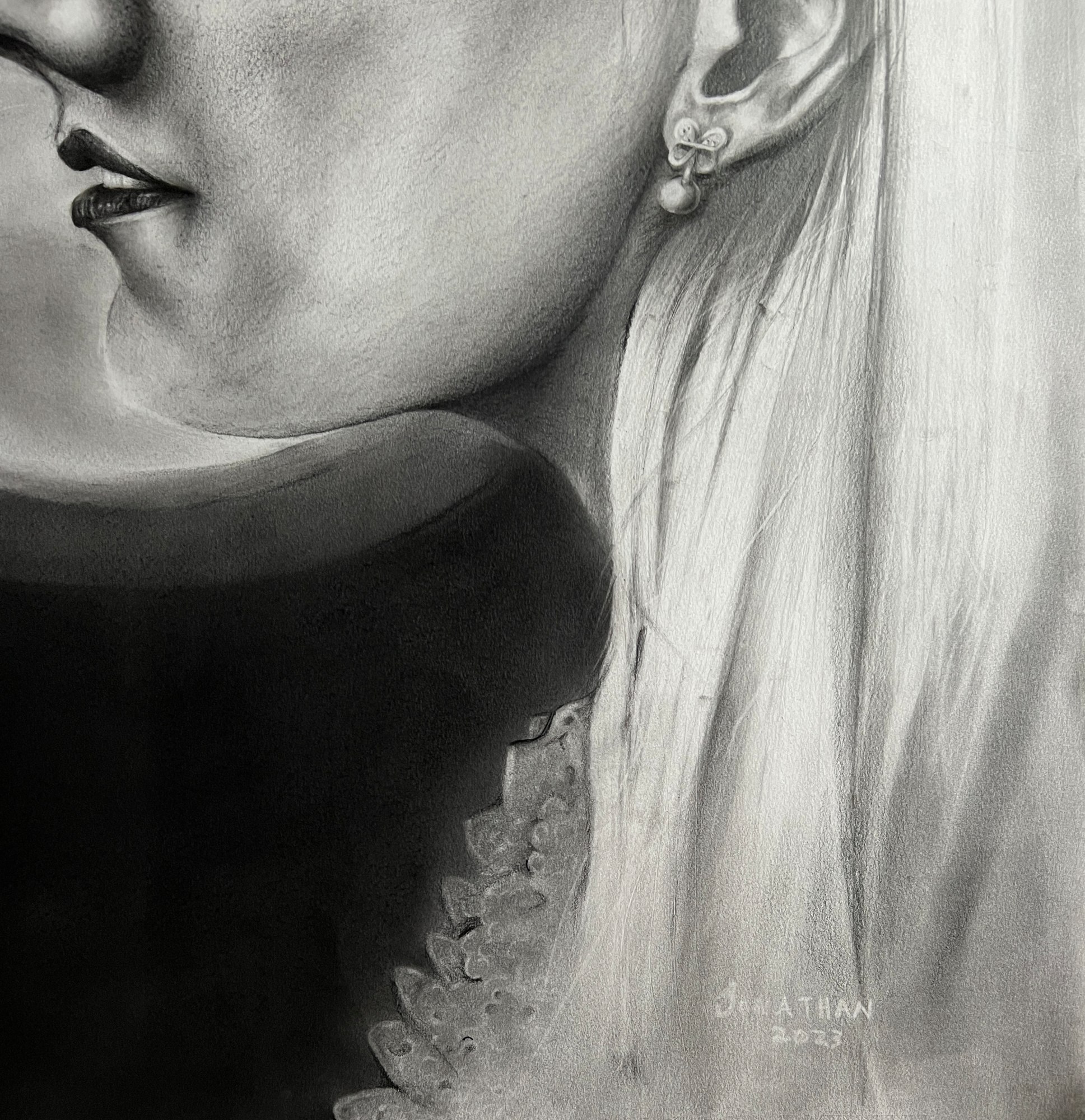 The drawing was primarily done using graphite pencils. However, for the background, graphite powder was used to achieve a smooth, powdery finish that contrasts with the more textured feel of the main subject.