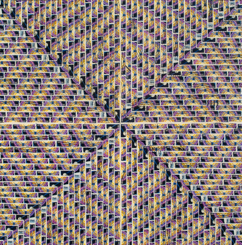 “Afterglow” is created using the stunning U.S. Skylab 10¢ issues from 1974, featuring the space station orbiting above the earth with a beautiful sun in the background. I consider this one of the most beautiful postage stamps ever issued in the U.S. A fascinating and powerful optical effect is created by layering the stamps in a specific way to create the interesting relationship between the glowing suns in each issue.