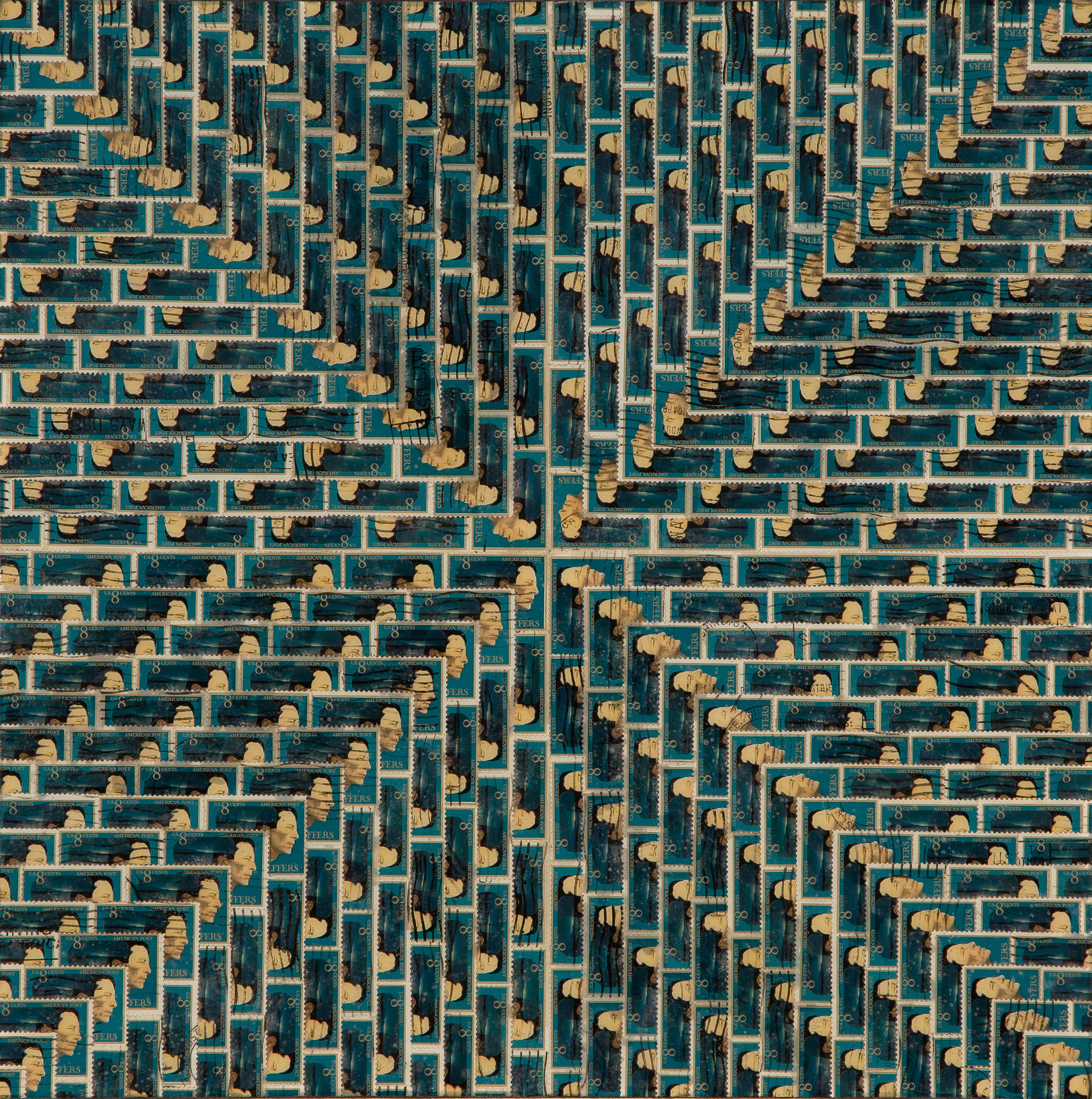 used U.S. postage stamps & resin on canvas
