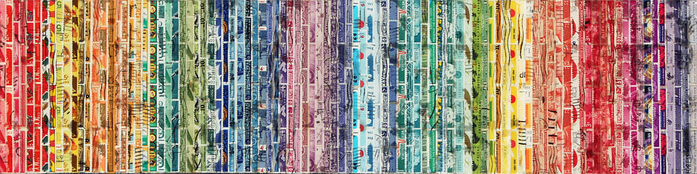 Used U.S. postage stamps and resin on cradled wood panel 6" x 24" or 24" x 6" (wired for hanging in both formats) 2015