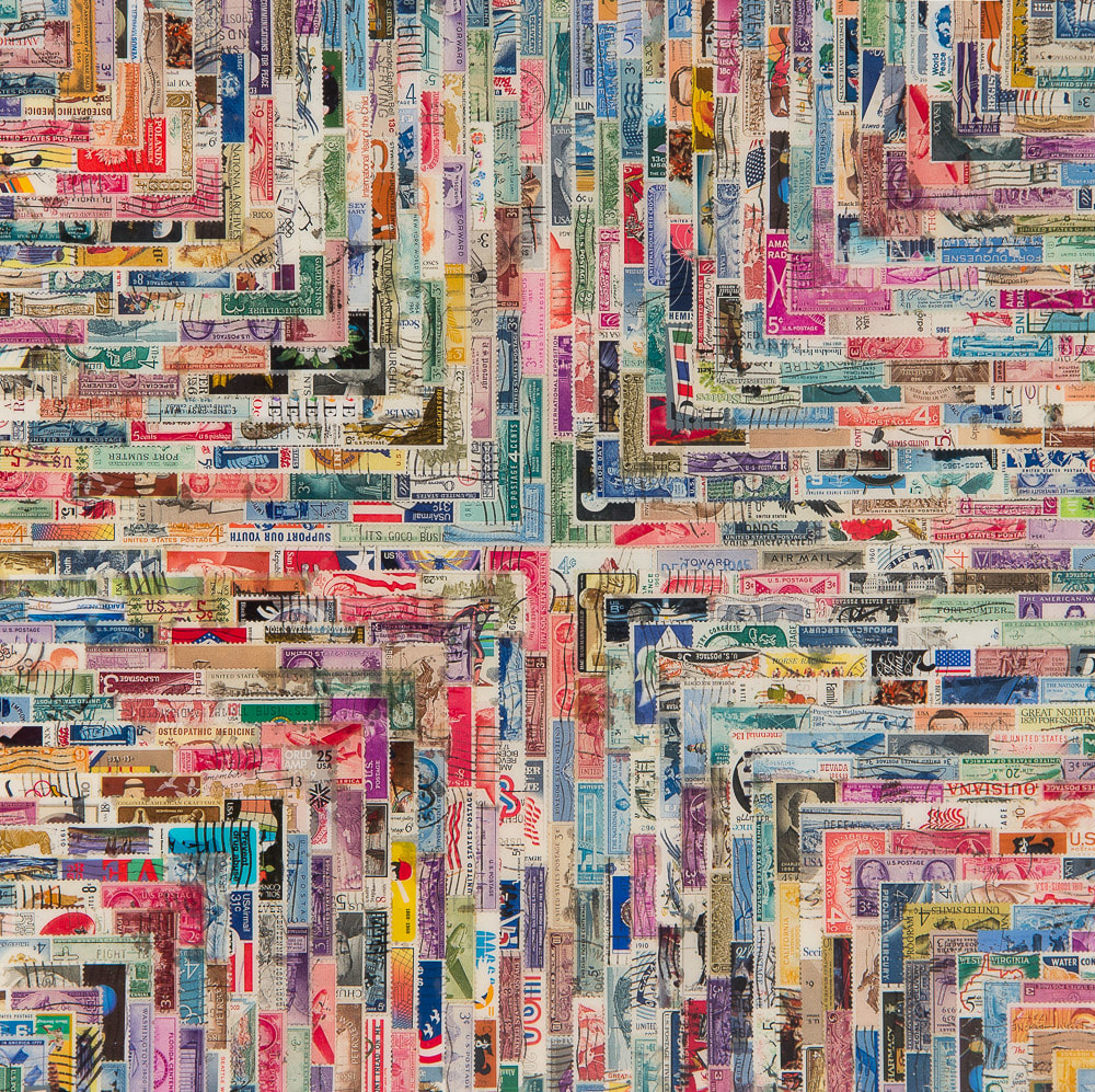 Used U.S. postage stamps and resin on canvas 16" x 16" 2016