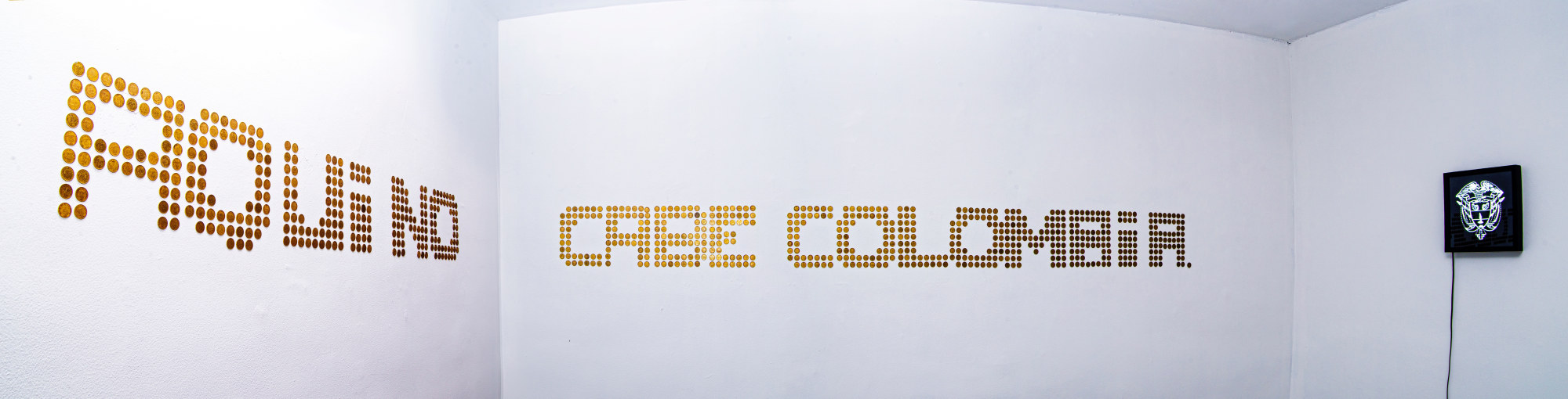 Aquí No Cabe Colombia es una intervención diseñada para pared donde se retoma la aproximación a la idea de imaginario Nacional desde el concepto del dinero disponible, al colocar 1500 monedas de 100 pesos en sentido vertical, se re-dibuja la Obra del Maestro Antonio Caro. La misma hace referencia al cómo la Historia Contemporánea se actualiza como un concepto difuso con el pasar del tiempo casi dos décadas después de su creación.