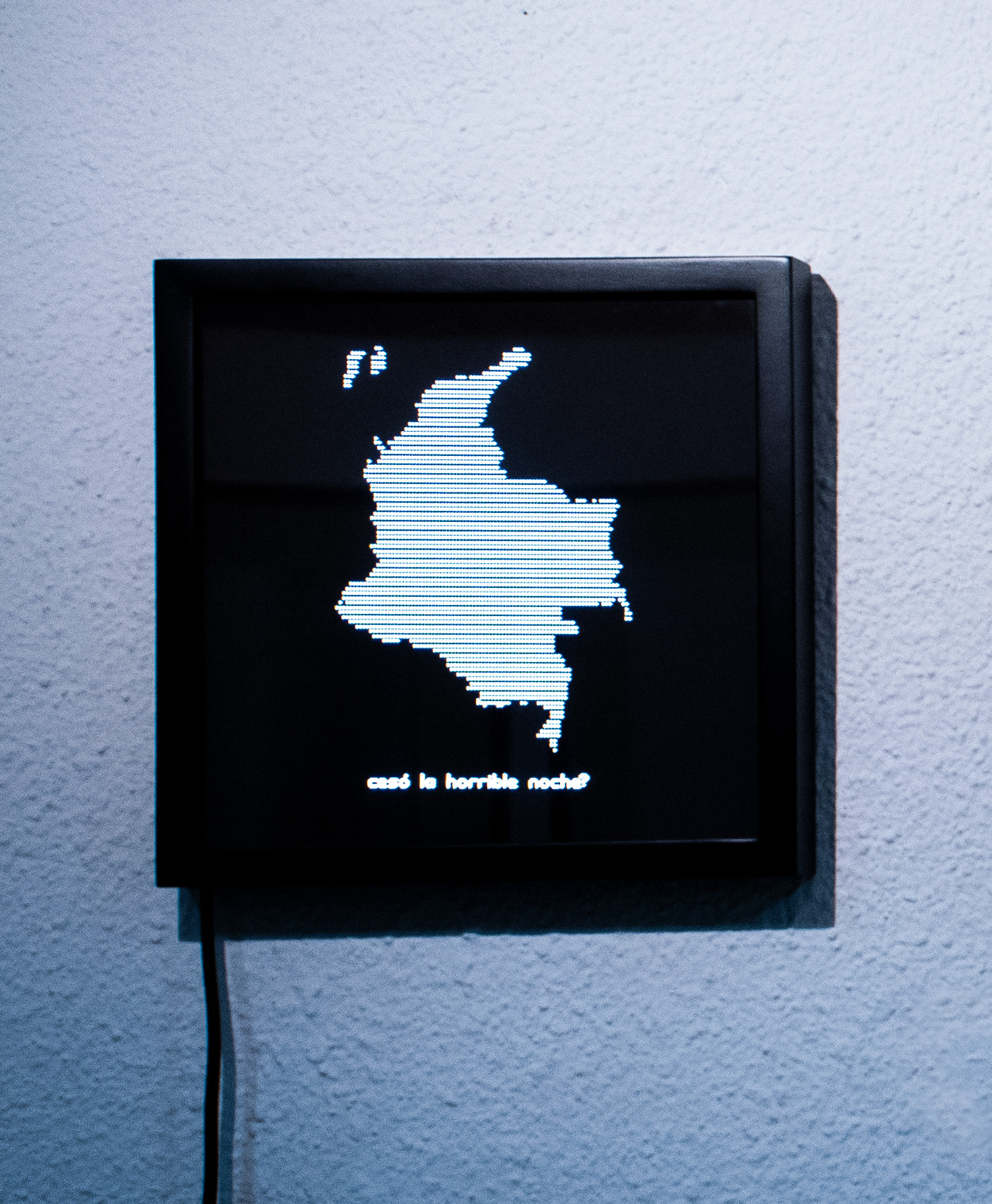 Ausencias - ¿Cesó la horrible noche? es una pieza que hace parte de la serie de Dibujos Nacionales. Esta propuesta desarrolla una aproximación a la Historia Nacional y a su relación con el Arte Colombiano, para revisar de forma crítica la realidad política del país. En ese orden de ideas, el apropiarse del mapa de la República para sugerir una nueva manera de leer sus valores, en el presente. Esto permite establecer una actualización para ese contexto particular, planteado ya siglos antes por medio de texturas y luminosidades. La idea detrás de esta pieza es generar una imagen a partir de las perforaciones y los elementos faltantes, señalando la perspectiva y el relativo lugar del punto de vista del observador.