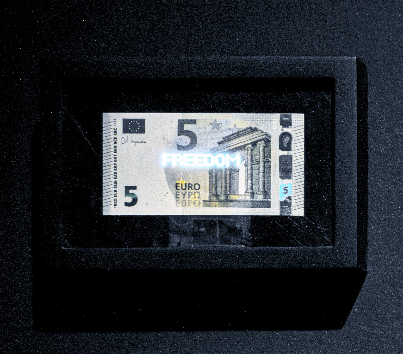 Planetary Values- 5 Euro Bill / (Freedom) is a unique approach to global politics. It focuses on the Euro bill, one of the main currencies in the world economy. This project highlights the most frequently mentioned values from the European Union’s Constitution by using laser cuttings to create perforations in the bills, which are then illuminated by LED lights.