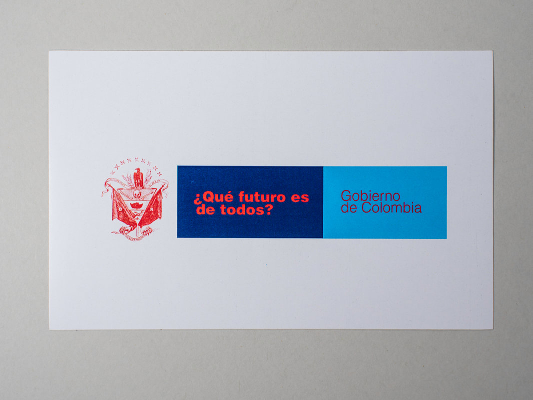¿Qué futuro es de todos? (2022) es un proyecto que hace parte de la serie de Dibujos Nacionales. Ésta se interesa por la construcción de la imagen de País, para desde allí desarrollar una aproximación a la Historia Nacional desde una serie de asociaciones que se enfocan en la Historia y la Memoria. Esta pieza propone una apropiación y una re-interpretación de la imagen institucional del Gobierno Nacional vigente de 2018 a 2022, la cual consta de un escudo, un slogan y el nombre del país. Desde esta propuesta inicial, se remplaza el escudo por un elemento histórico, el Escudo de la Regeneración, realizado por Alfredo Greñas para el periódico El Zancudo, publicado en Bogotá el 20 de julio de 1890. Allí, “… el cóndor cierra sus alas y está encadenado. Nueve estrellas, que son calaveras, corresponden a la división geográfica de nueve departamentos. “Ni libertad, ni orden” proclaman dos cintas a lado y lado del cóndor. En el primer campo aparece una calavera y dos tibias, en el segundo un bonete que representa el poder del clero, y en el tercero un caimán —Estados Unidos— que se come el canal de Panamá. Dos banderas enmarcan el escudo: una ostenta una calavera y la otra una cruz. De las astas penden escapularios. Abajo salen dos garras que sostienen una cinta que dice REGENERACIÓN”.” * En el centro de la imagen, el slogan “El futuro es de todos” es remplazado por la pregunta “¿Qué futuro es de todos?”, para sustituir el color negro de la imagen por el rojo de la bandera. La pieza plantea señalamientos y propone preguntas en relación a momentos específicos de la Historia Patria para así generar diálogos entre el pasado y el presente, delimitando un espacio de reflexión para quien observa.