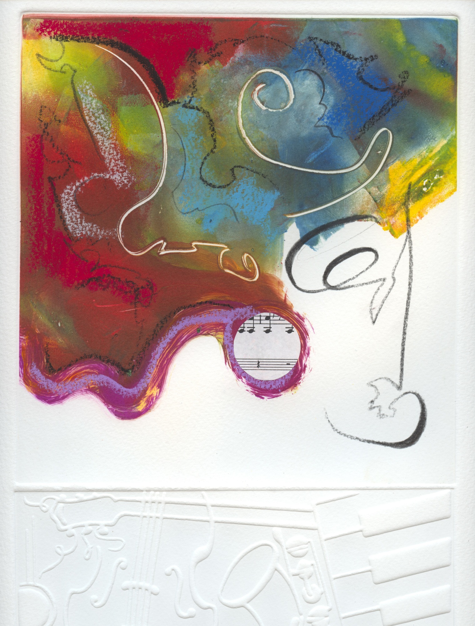 Lithograph with paper collage in colors, on wove paper, with full margins and embossed lower edge. Signed and numbered 1/1 in pencil in the margin.