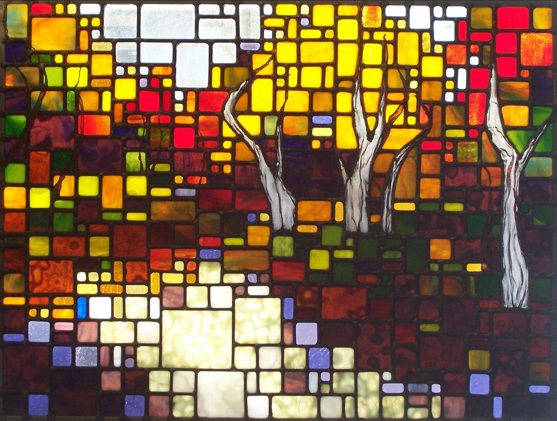 Inspired by Tadashi Asoma’s painting ‘Daybreak’, the fiery reds, golds and ambers of autumn set against a backdrop of deep purple shadows. Copper mesh screening inset in the openings for the trees adds yet another layer of depth to the nearly 450 pieces of glass that capture the translucence of light.