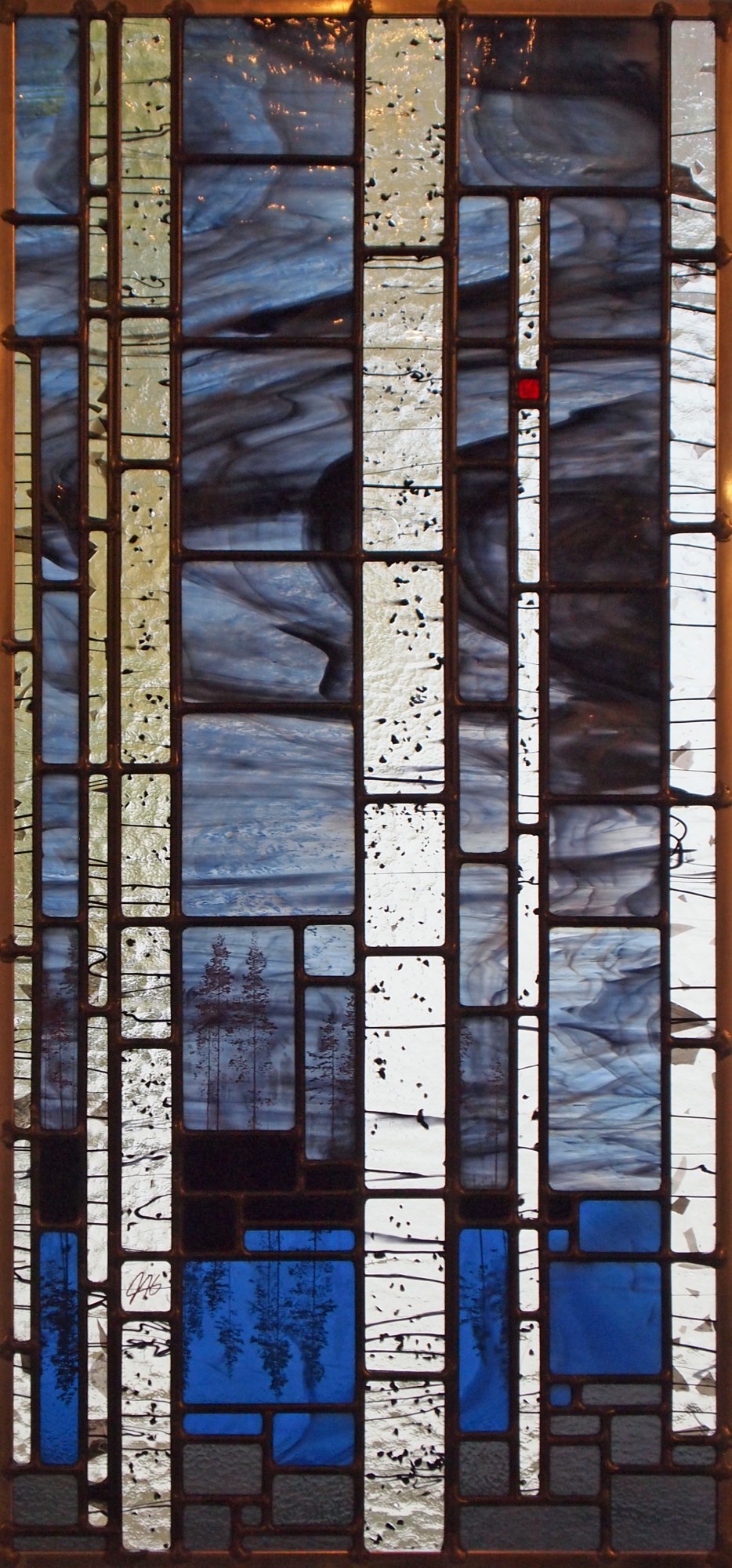 An island in the north woods, with pine trees fused into the glass, reflects in the blue water beneath the thunderheads billowing in the sky. Island trees fused on the front, with the reflected trees fused on the reverse side create a shadow effect in the translucent blue glass.