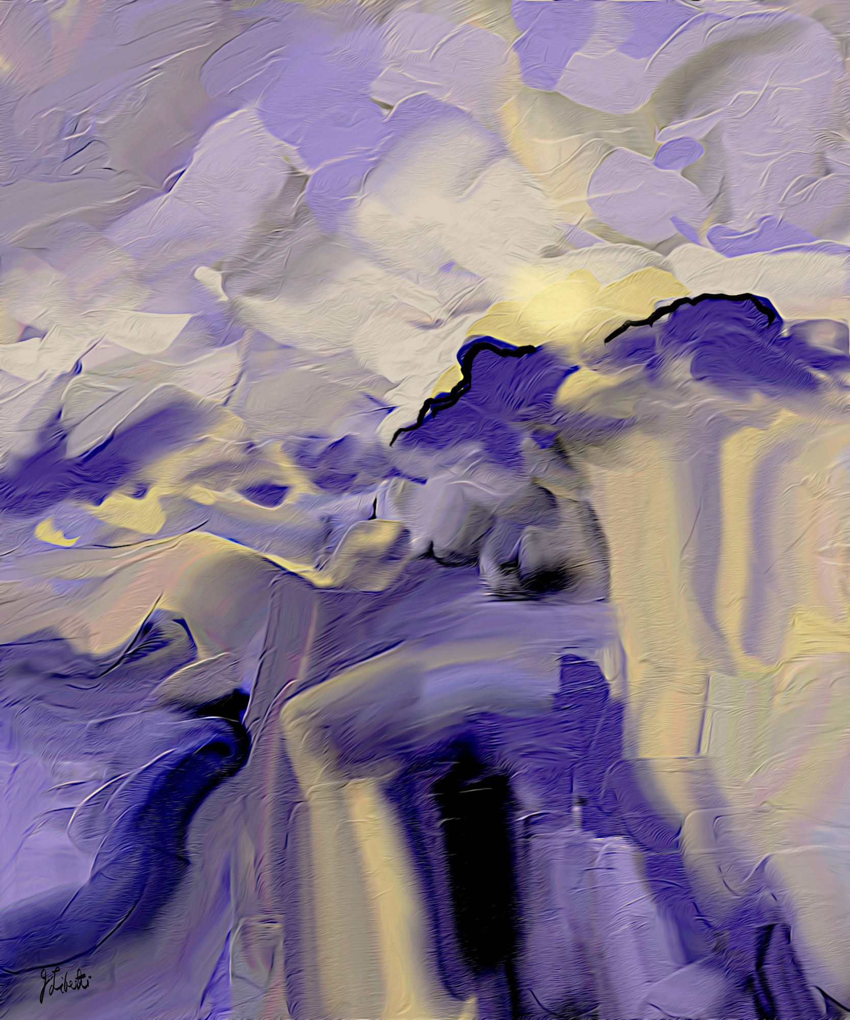 n this evocative abstract painting, deep purple mountainous shapes rise, embodying the journey of accessing deep intuition. Lighter shades of purple whisper through the canvas, while swirling highlights of pale yellow and white cascade, illuminating the scene. Together, they capture the essence of new inspiration and the light within.