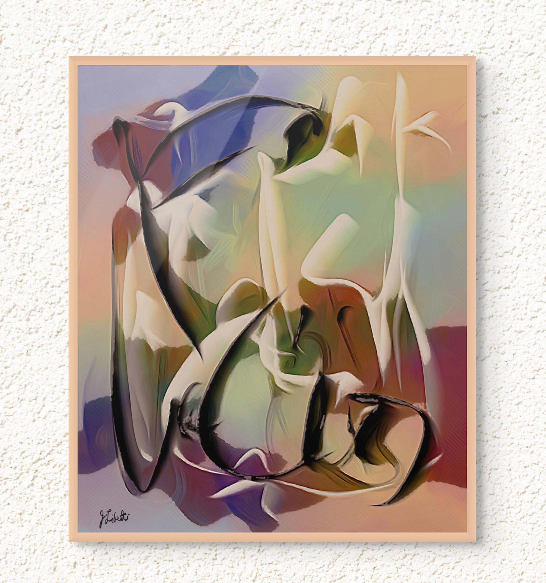 This painting symbolizes an internal conflict between hope and despair. A vibrant canvas emerges with pastel blues, greens, and oranges, where constraining bold coils of black and white seem to unwind as they swirl dynamically against deep blue and burgundy shapes. This evocative interplay creates a powerful 3D effect, embodying the essence of freedom and hope, inviting viewers into its depths. This limited edition print (1/3) is presented on textured 320 gsm, archival, cold-pressed, bright white cotton rag paper using premium eco-solvent archival inks for vivid colors. The print is mounted on a foam core backing and showcased in a thin frame with optical-quality acrylic glazing.