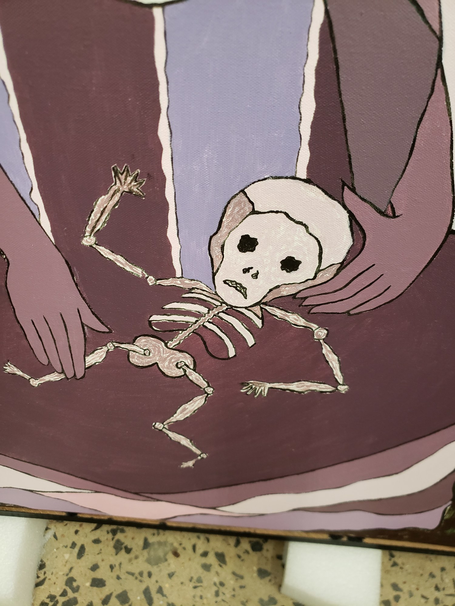 The background of this stark color contrasted painting has a cross on the left and an Islamic flag symbol on the right. A faceless figure sits in the middle with a skeleton of a child on their lap. One can only image the conflict between these two opposing religions has ended in death and destruction to the innocents. A powerful statement from the artist on the unending effects of religious conflict that has ended in hundreds of years of unresolved wars. A sober statement made by many artists before and contemporary with him, as Picasso in Guernica and others.