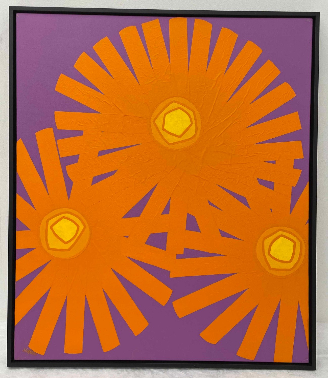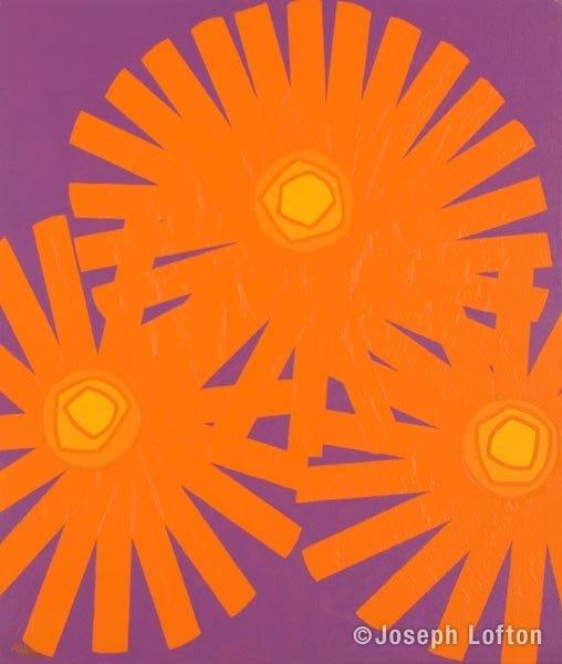 Three intensely orange sun-like flowers adorn a purple background. The center of each flower has a series of yellow circles which radiate from bright yellow to darker yellow until they blend in with the bloom of the flower.