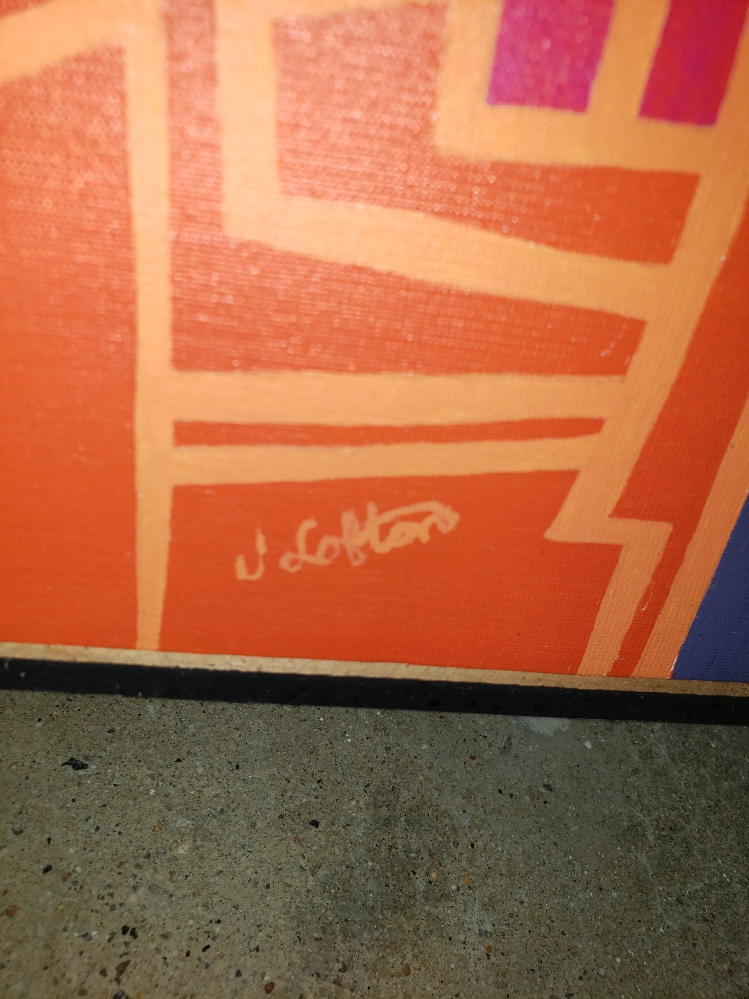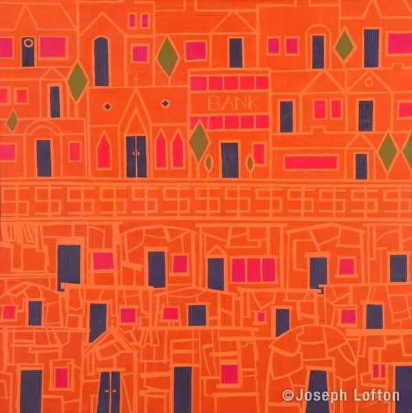 A cleverly constructed modernistic composition that begs the viewer to consider the details. On careful examination one discovers the underlying drawing is a town with various buildings outlined; ordinary houses, restaurants and a church which is slightly off center dominates the composition. What appears as abstract patterns in the work in pink, blue and green colors turn out to be delightful images of windows, trees and doors. The brilliant orange background activates those different colors creating a jewel-like effect.