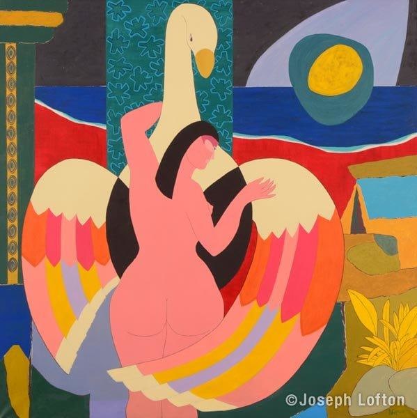 Leda was a beautiful woman, and her beauty attracted the attention of Zeus, who spied her from his throne on Mount Olympus. The beauty of Leda roused Zeus to action, and the god transformed himself into a magnificent swan.A nude, pink woman with black hair has one arm around a large swan and the other arm, with an open hand, is bent slightly. She is facing the swan and being embraced by one of the swan’s wings. The swan’s wings have a little bit of blue, yellow, and orange; but most of its wings are dark and light shades of pink with off white at the top and bottom of each wing. The woman is the same color as one of the pinks in the swan’s wings. The subjects are standing in front of a multicolored background with a panel of wallpaper containing flowers behind the swan and gold foliage in the lower right corner.