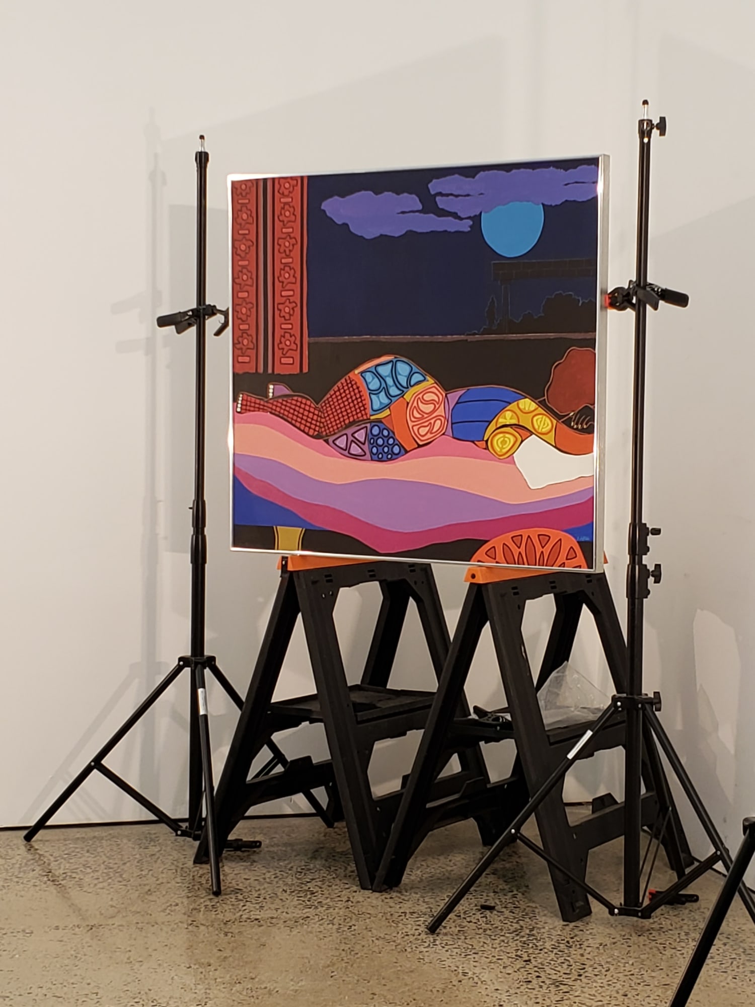 A female appareled in several patterns and colors is laying in a bed with waves of pinks and purples. She is resting her head on her arm and her face is not seen. There is a window with red and black floral curtains on the left. The window reveals a view of the dark blue night sky with a lighter blue full moon as purple clouds are wafting by. Off in the distance, barely visible, are silhouettes under an open structure with a roof.