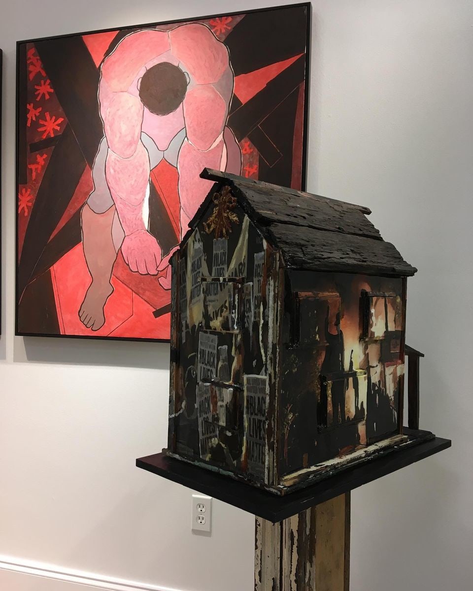 This array of salmon, pinks, and black colors shows the subject surrounded by dark geometric shapes with star-like shapes filling some of the void.