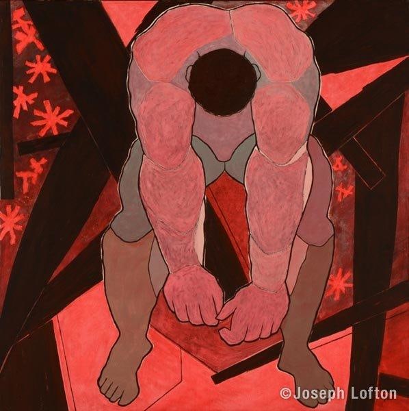 A muscular man, with head bowed and arms dangling, appears to be exhausted. His face is not apparent because he is looking down and only the top if his head is visible.