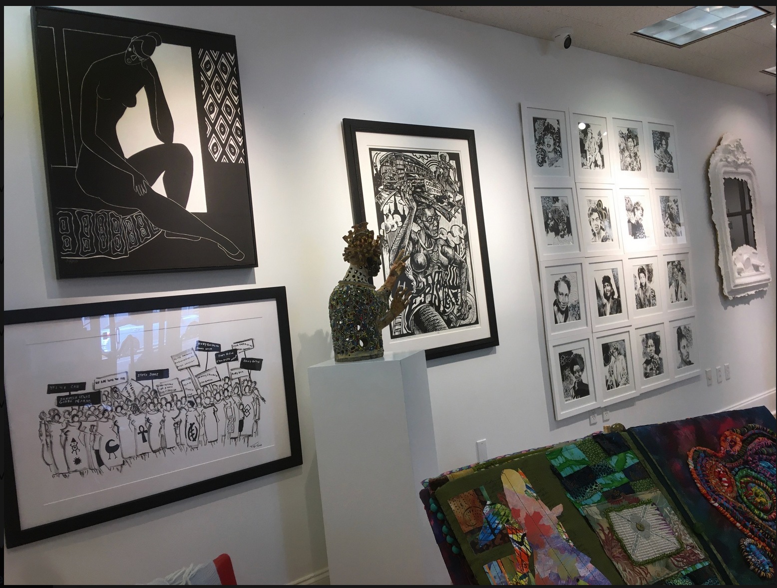 In Resting Lofton seems to pay homage to Matisse’s Blue Nude series of cut outs. In 1952, Henri Matisse created a series of blue color lithographs using his cut-out technique, titled Blue Nudes. In Lofton’s composition, the female figure is attenuated and flat in form. Yet, one can sense the mood of the painting from the pose of the figure with the head resting on the hand. Could it be despair or one of deep meditation? Lofton limits his palette to black and white with white lines delineating different objects in the painting. This separation of forms is created by his technique of using thin strips of canvas (like Matisse’s strips of colored paper) to make painting appear like a print. Lofton is a master of using less to convey more, few delineated lines create forms and a sense of more than two-dimensional space. The decorative touches show an interest in African textile patterns. Matisse, in this series of Blue Nudes was also inspired by African art.
