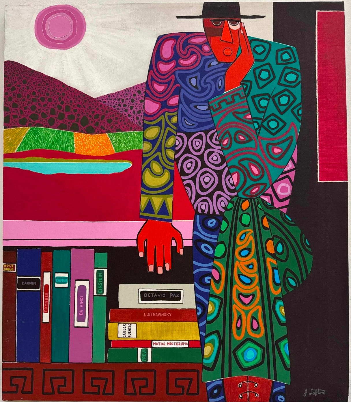 The Cogitator is a masterpiece of color, design and placement. A cogitator is someone who thinks deeply about something, who meditates and reflects. The figure of the cogitator, occupying one third of the compositions, sits in repose. His outfit vibrates with wildly painted patterns and colors, perhaps inspired by indigenous Mexican and African art. The book authors left to right and top to bottom are Holy Bible, Darwin, Toynbee, Camus, Da Vinci, Einstein, Octavio Paz, I. Stravinsky, Carlos Fuentes, Matos Moctezuma, Freud.