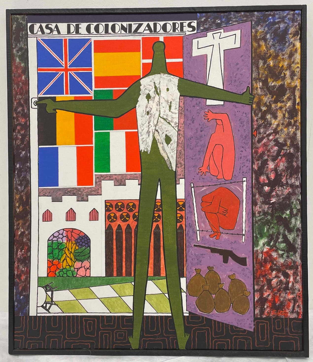 Above the doorway is signage that states: “Casa de Colonizadores.” Colonizadores is a Spanish word that can be translated to English as settler. “Settler,” seems so benign as there have been nightmarish scenarios of colonialism’s impact on indigenous people. Many of Lofton’s works offer political commentary specifically aimed at or generally made about hegemony power structures. Historically, the colonizing country imposes its beliefs by force. In general, the people who establish colonies in a foreign land often do so with the intention of exploiting its resources, expanding their territory or spreading their culture and beliefs. Often ending in genocide and cultural annihilation, native identity barely survives. Flags of various countries seems to hang like banners on the upper section of the painting including what appears to belong to Belgium, England, and France. These are countries that exerted power over various countries and indigenous people with repercussions still reverberating today. The imposing figure with tattered clothing opening the door or walking through it is faceless with back turned toward the viewer. Is he symbolic of the colonizer or colonized?