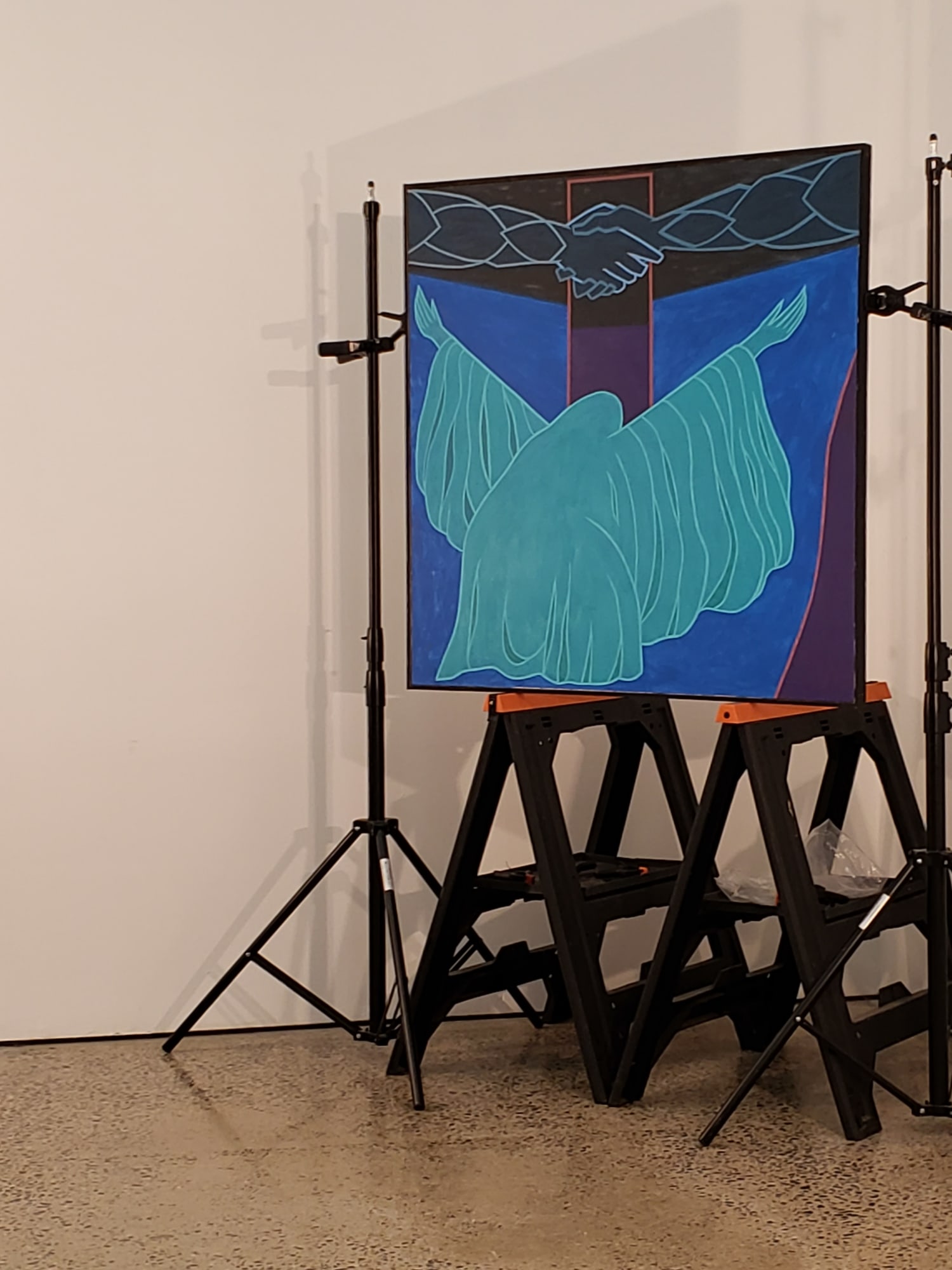 This series of paintings with a dominant figure painted in turquoise seems to suggest political activism on the part of the artist. Simplistic in its presentation it suggests peace attained with two hands grasping each other in a handshake. Motives, Atlantic Footprints, What Now and Truce seem to be a series of works painted in same color scheme and suggest political and social commentary.