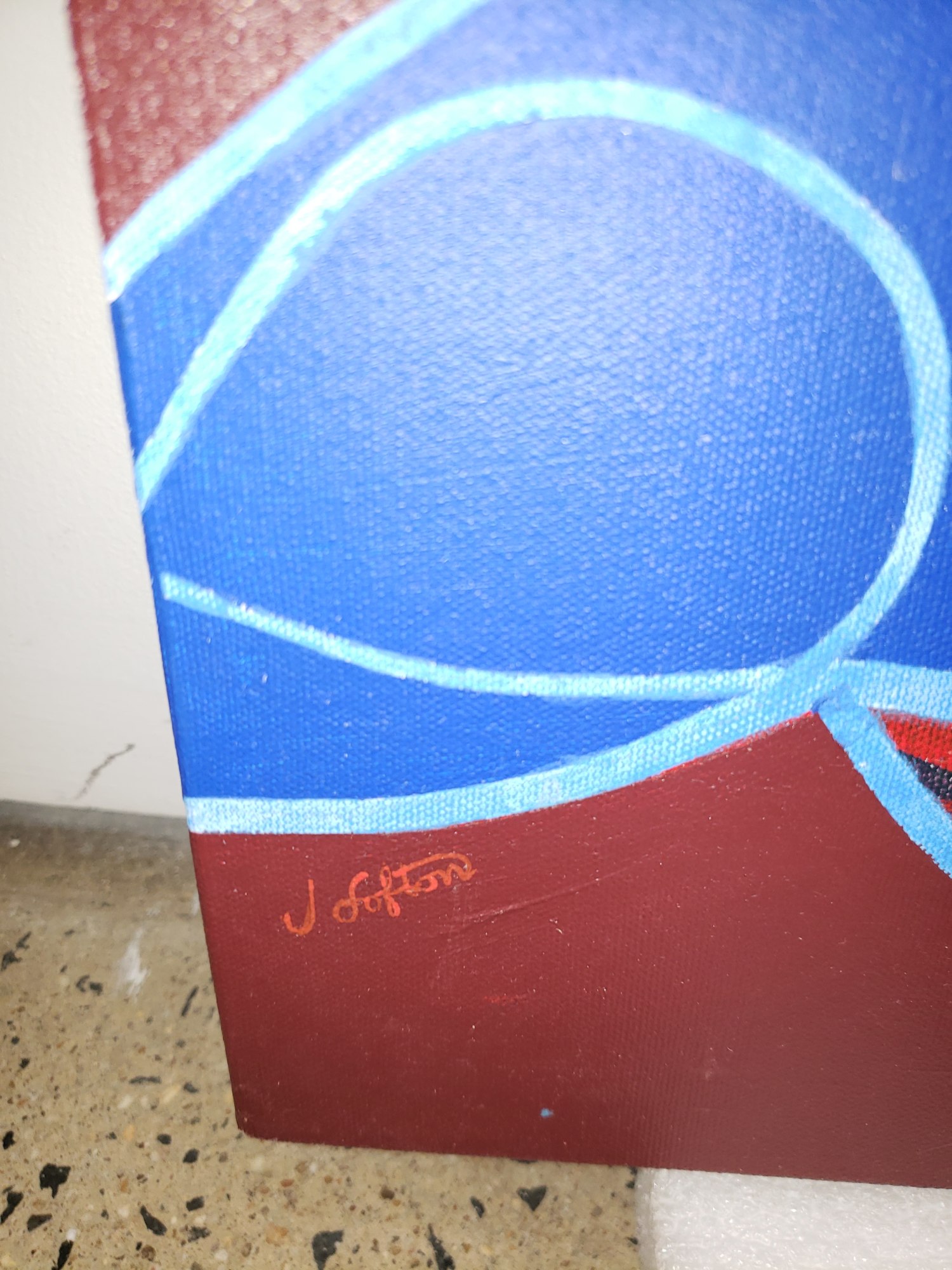 A sinewy nude blue Liberty with a crown and closed eyes is the central focus of this work. There is a sun-like circle in the upper left corner with shades of dark and light green radiating from a red and black center. The word “GREED” is painted in the inner circle. There is a multicolored face in the lower right with open eyes and a circular mouth.