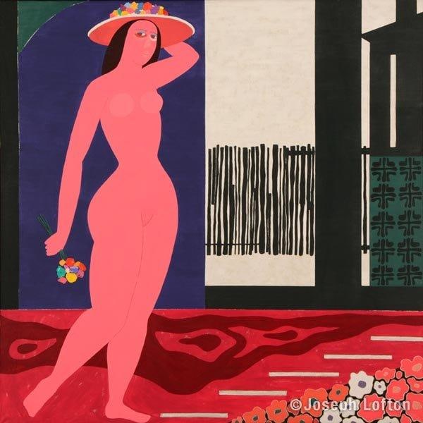 Nude woman gazing at viewer, holding hat onto head with left hand as she ascends stairs holding a bouquet of flowers in her right hand that match those decorating her hat.