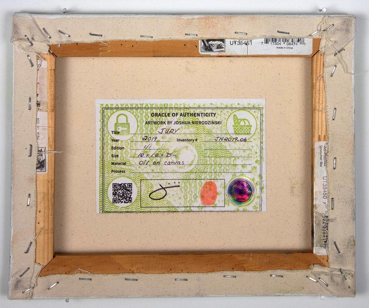 - Signature: Oracle of Authenticity on back with signature, fingerprint, title, date, dimensions, and medium. Includes QR link to nierodzinski.com and NFC tag that links to archive page.