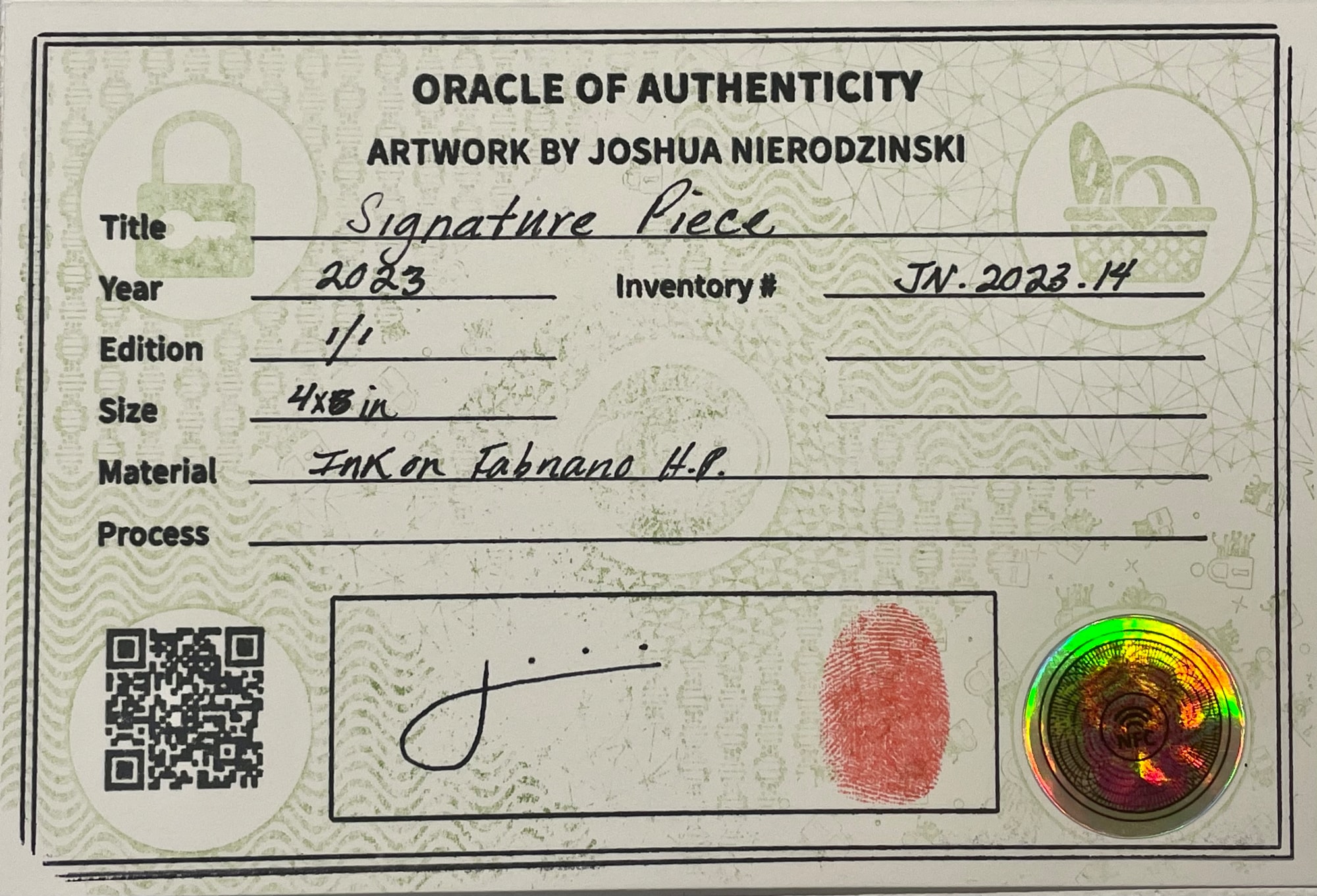 Title, date, dimensions and material within Oracle of Authenticity.