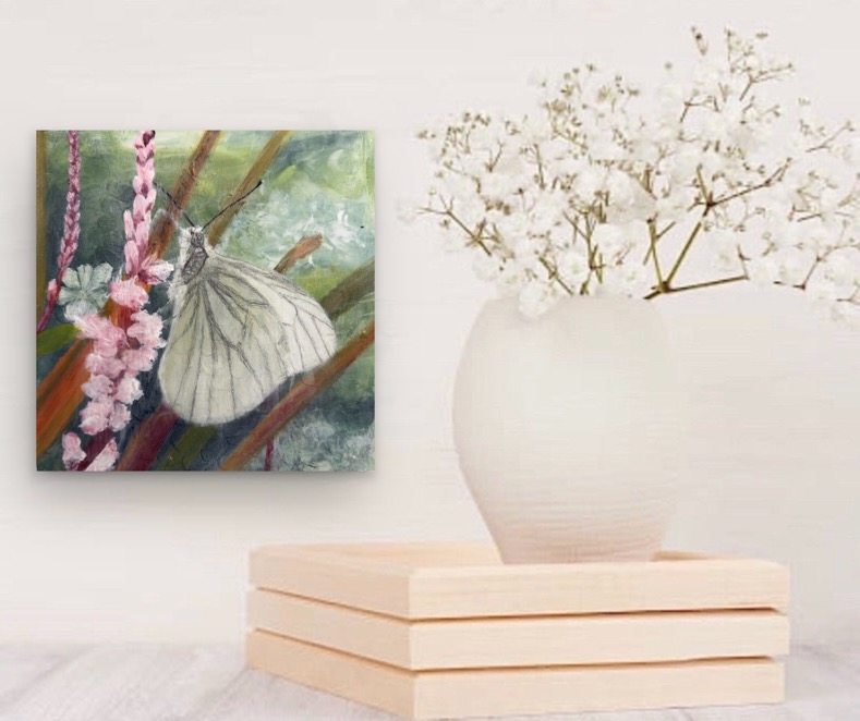 In a quiet hush of sunlit green, a delicate green-veined white butterfly perches on a slender spire of blush-pink blossoms. Its wings shimmer with silvery lines, like whispers of moonlight etched into fragile parchment—weightless, yet timeless.