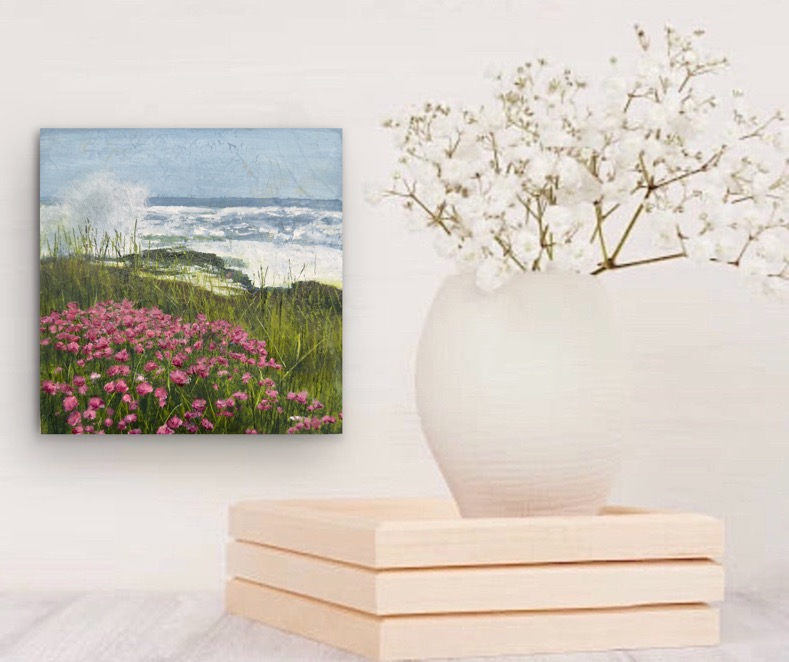 This painting captures the breathtaking energy of the coast—where land, sea and bloom converge in a dance of contrast and vitality. A burst of magenta wildflowers fills the foreground, their delicate petals glowing against a backdrop of rich greens and the rhythmic power of ocean waves. The sea rises in a spirited swell, its spray dissolving into mist beneath a serene, pale sky.