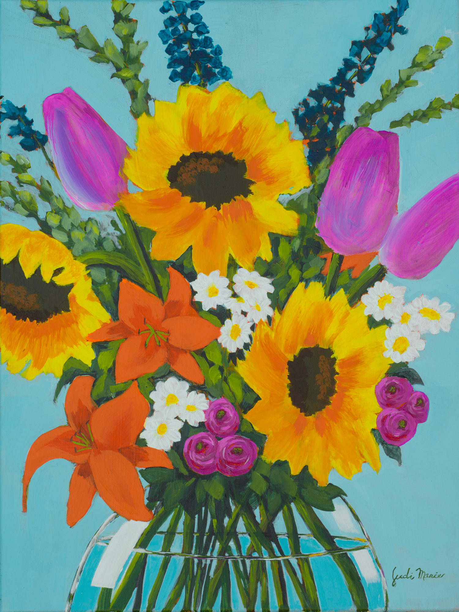 Abundant Joy was what I was feeling one day. Knowing that all emotions, including joy, are temporary states, I planned this painting that same day. My intent was to try to recreate a sense of joy, happiness, and exuberance. I chose a variety of happy colors and I painted exaggerated yellow sunflowers, tall magenta tulips and orange daylilies that acted like they could hardly contain themselves. If you feel happy or smile when you see it, I have been successful!