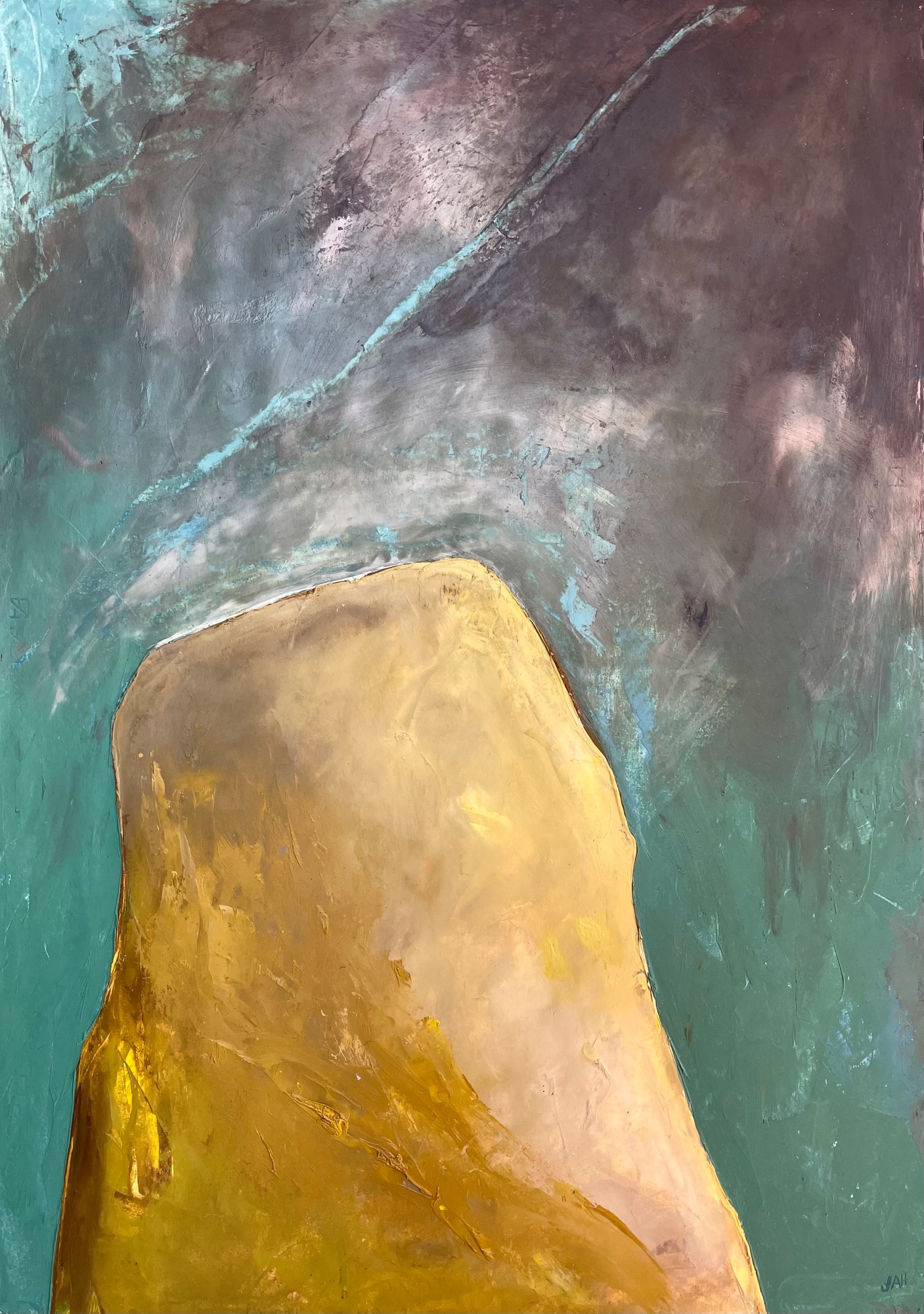 This painting is part of a collection I call Abstract Landscapes. The images were inspired by landscapes either from an airplane view or looking straight on at a hill/sky connection or water/hill/sky connection. The titles are derived from places I've been to or names of rivers, mountains, places that sound like the resonance of the painting, mostly by color combinations and mark making. A dozen of these paintings were displayed at a Salon/Gallery called Architects and Heroes on Powell Street in 1989.