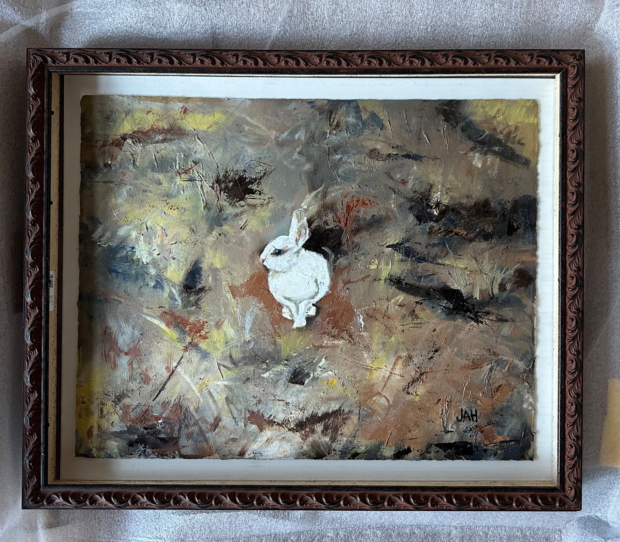 My friend had a special visitor set up home in his backyard. Dug a hole under his steps, sped around his land amongst red dirt and sagebrush. Stood out bright and white. This rabbit became his unexpected companion. Oil painting on Arches oil paper, float mounted on archival board, and framed behind UV museum quality glass and wood frame. Painting is ready to hang.
